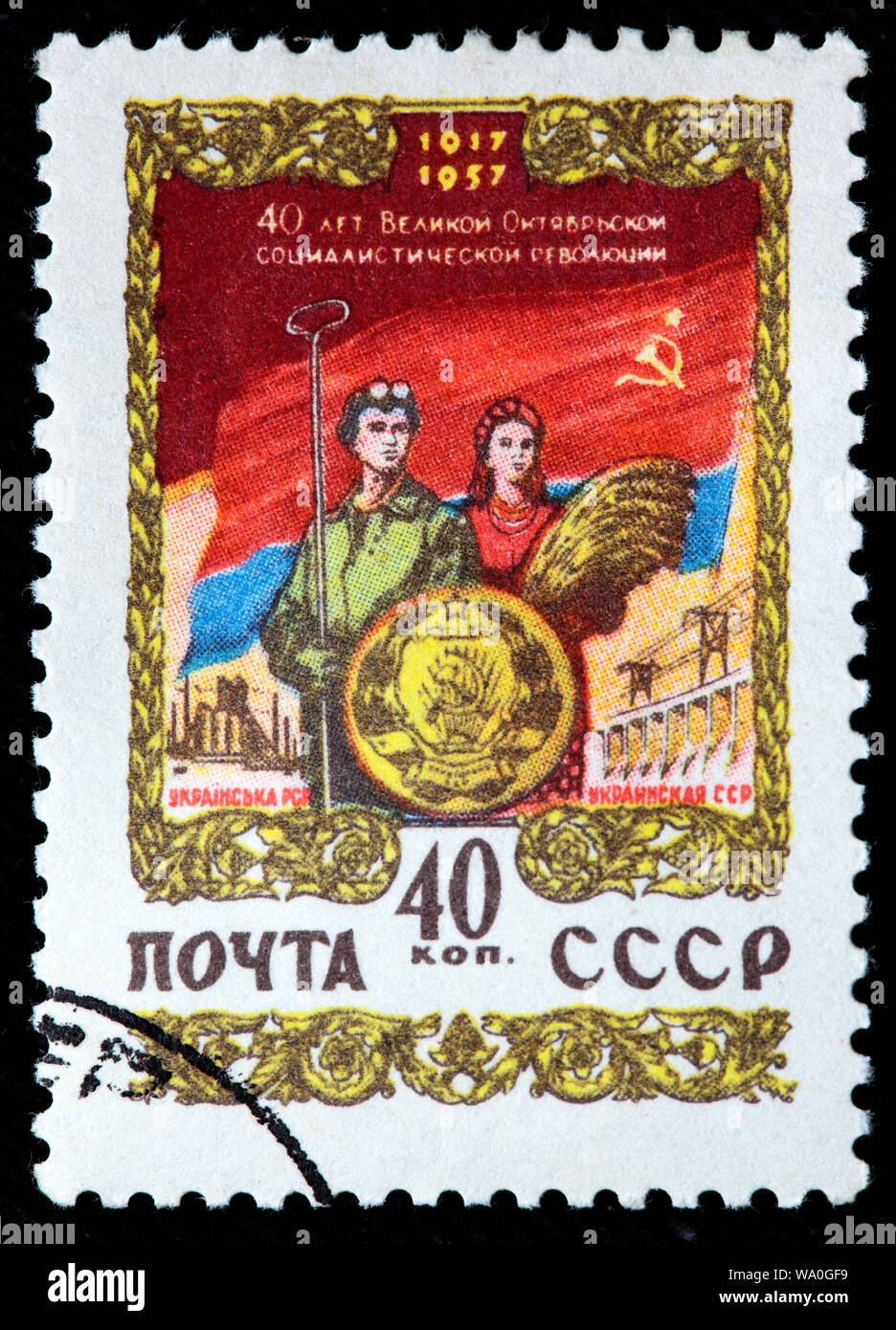 40th Anniversary of Great October Socialist Revolution, postage stamp, Russia, USSR, 1957 Stock Photo.