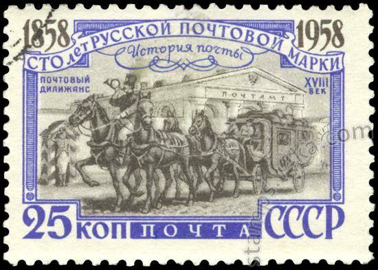 Почтамт и почтовый дилижанс XVIII века на марке почтового блока СССР (1958) Почтамт и почтовый дилижанс XVIII века на марке почтового блока СССР (1958)