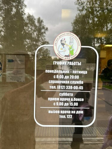 {"8q580":{"state":{"headerProps":{"form":{"action":"/medicine/clinic/detskaya-gorodskaya-poliklinika-45_1059696637","searchLabel":"Найти","logo":{"href":"//ya.ru","size":44}},"actions":{},"user":{"loggedIn":false,"ariaLabel":"Меню","plus":false,"birthdayHat":false,"child":false,"dialogProps":{"host":"yandex.ru","lang":"ru","project":"medicine","queryParams":{"exp_flags":"skin","preset":"oceania","utm_source":"medicine-app"},"retpath":"https%3A%2F%2Fyandex.ru%2Fmedicine%2Fclinic%2Fdetskaya-gorodskaya-poliklinika-45_1059696637%3Fgeov_results%3D1%26lr%3D213%26oid%3Db%253A1059696637%26text%3D%25D0%25BA%25D0%25BB%25D0%25B8%25D0%25BD%25D0%25B8%25D0%25BA%25D0%25B0%26ncrnd%3D15006","tld":"ru","platform":"desktop"},"loginUrl":"https://passport.yandex.ru/auth?retpath=%2F&origin=serp_desktop_auth_new","loginText":"Войти"},"navigation":{"tabs":[{"id":"search","label":"Поиск","url":"//yandex.ru/search","params":{"text":"[$query]","site":"[$site]","source":"tabbar"}},{"id":"search_neuro","label":"Алиса","url":"//yandex.ru/search","params":{"text":"[$query]","site":"[$site]","source":"tabbar","promo":"force_neuro"}},{"id":"medicine","label":"Медицина","url":"//yandex.ru/medicine","params":{"lr":"[$lr]","from":"tabbar"},"target":"_self"},{"id":"images","label":"Картинки","url":"//yandex.ru/images/search","params":{"text":"[$query]","site":"[$site]","noreask":"[$noreask]","nomisspell":"[$nomisspell]","parent-reqid":"[$reqid]","from":"tabbar"}},{"id":"video","label":"Видео","url":"//yandex.ru/video/search","params":{"text":"[$query]","site":"[$site]","noreask":"[$noreask]","parent-reqid":"[$reqid]","from":"tabbar"}},{"id":"maps","label":"Карты","url":"//yandex.ru/maps","params":{"text":"[$query]","source":"serp_navig"}},{"id":"shopping","label":"Товары","url":"//yandex.ru/products","params":{"lr":"[$lr]","from":"tabbar"}},{"id":"finance","label":"Финансы","url":"//yandex.ru/finance","params":{"lr":"[$lr]","from":"tabbar"}},{"id":"realty","label":"Квартиры","url":"//yandex.ru/realty","params":{"lr":"[$lr]","from":"tabbar"}},{"id":"translate","label":"Переводчик","url":"//translate.yandex.ru","params":{"text":"[$query]","from":"tabbar"}},{"id":"all","label":"Все","url":"//yandex.ru/all","params":{"text":"[$query]","from":"tabbar"}}],"selectedTabId":"medicine"},"context":{"query":"Детская городская поликлиника № 45","reqid":"1770618713870644-4127299922071098438-balancer-l7leveler-kubr-yp-vla-200-BAL","lr":"213","aliceDeeplink":"{\"text\":\"Детская городская поликлиника № 45\"}","counters":{"type":"b","data":{"$header":"8q58z000","logo":"8q58z001","advanced-search":"8q58z002","login":"8q58z004","usermenu":"8q58z005","market-cart":"8q58z007","more-button":"8q58z008","cbir":"8q58z009","clear":"8q58z00a","submit":"8q58z00b","alice":"8q58z00c","favorites":"8q58z00d","$navigation":"8q58z00e","item":"8q58z01l","tab-search":"8q58z012","tab-search_neuro":"8q58z014","tab-medicine":"8q58z016","tab-images":"8q58z018","tab-video":"8q58z01a","tab-maps":"8q58z01c","tab-shopping":"8q58z01e","tab-finance":"8q58z01g","tab-realty":"8q58z01i","tab-translate":"8q58z01k","tab-all":"8q58z01m"}}},"loggedIn":false,"mix":{"outerContainer":[]},"suggestUrl":"/medicine/suggest","suggestPlaceholder":"Найти врача, клинику, услугу","suggestParams":{}},"baobab":{"parentNode":{"context":{"genInfo":{"prefix":"8q58w01-0-1"},"ui":"desktop","service":"medicine","fast":{"name":"unisearch/medicine","subtype":"header"}}}}},"type":"unisearch/medicine","subtype":"header"},"8q581":{"state":{"headerProps":{"title":"Детская городская поликлиника № 45","titleSize":"xl","url":"http://dgp45spb.ru/","pathItems":[{"text":"dgp45spb.ru"}],"schedule":{"title":"Открыто до 20:00","days":{"mon":{"intervals":[{"from":"08:00","to":"20:00"}],"current":true},"tue":{"intervals":[{"from":"08:00","to":"20:00"}]},"wed":{"intervals":[{"from":"08:00","to":"20:00"}]},"thu":{"intervals":[{"from":"08:00","to":"20:00"}]},"fri":{"intervals":[{"from":"08:00","to":"20:00"}]},"sat":{"intervals":[{"from":"09:00","to":"15:00"}]},"sun":{}},"historySyncId":"org-1059696637-schedule-0"},"logo":"https://avatars.mds.yandex.net/get-altay/14774583/2a00000198bcb1c18269576bcf04b3599d5c/XS","siteMetrika":{"type":"reach-goal","metrikaCounterId":"87134025","objectId":"1059696637","objectTitle":"Детская городская поликлиника № 45","event":"site","goal":"site"},"blueTitle":true,"reviewsCount":513,"reviewsViewerId":"one-org-modal-card-reviews-1059696637","profileOrgLink":"https://yandex.ru/profile/1059696637?lang=ru","rating":{"value":4.4,"base":5,"decimalSeparator":","},"category":"Детская поликлиника"},"tabsProps":{"initialTab":"about","aboutTabProps":{"id":"about","title":"Главное","aboutContentProps":{"galleryProps":{"oid":"1059696637","map":{"height":158,"width":158,"assetId":"ua_34_4230403003","url":"https://yandex.ru/profile/1059696637?lang=ru&no-distribution=1&view-state=mini&source=wizbiz_new_map_single"},"height":158,"isInsidePopup":false,"context":{"type":0,"params":{"tabName":"photo"}},"intent":{"type":2,"params":{"oid":"1059696637","tabName":"photo","subtype":"company"}},"photoTiles":{"items":[{"image":"https://avatars.mds.yandex.net/get-altay/219656/2a000001874e99f038586b5a9fc898d7afb5/L","tagId":"All","name":"Все фото","count":"32","width":211,"height":158,"logNodeAttrs":{"action":"open_photo"}},{"image":"https://avatars.mds.yandex.net/get-altay/10829645/2a0000018ae222131d11e34d1912ff4743f8/L","tagId":"Exterior","name":"Снаружи","count":"20","width":130,"height":158,"logNodeAttrs":{"action":"open_photo"}},{"image":"https://avatars.mds.yandex.net/get-altay/6203703/2a0000018971ea6983c93f5514b16d1bec26/L","tagId":"Interior","name":"Внутри","count":"5","width":130,"height":158,"logNodeAttrs":{"action":"open_photo"}},