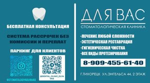 {"8brd0":{"state":{"headerProps":{"form":{"action":"/medicine/clinic/dlya-vas_47922139413","searchLabel":"Найти","logo":{"href":"//ya.ru","size":44}},"actions":{},"user":{"loggedIn":false,"ariaLabel":"Меню","plus":false,"birthdayHat":false,"child":false,"dialogProps":{"host":"yandex.ru","lang":"ru","project":"medicine","queryParams":{"exp_flags":"skin","preset":"oceania","utm_source":"medicine-app"},"retpath":"https%3A%2F%2Fyandex.ru%2Fmedicine%2Fclinic%2Fdlya-vas_47922139413%3Fgeov_results%3D1%26lr%3D213%26oid%3Db%253A47922139413%26text%3D%25D0%25BA%25D0%25BB%25D0%25B8%25D0%25BD%25D0%25B8%25D0%25BA%25D0%25B0%26ncrnd%3D69594","tld":"ru","platform":"desktop"},"loginUrl":"https://passport.yandex.ru/auth?retpath=%2F&origin=serp_desktop_auth_new","loginText":"Войти"},"navigation":{"tabs":[{"id":"search","label":"Поиск","url":"//yandex.ru/search","params":{"text":"[$query]","site":"[$site]","source":"tabbar"}},{"id":"search_neuro","label":"Алиса","url":"//yandex.ru/search","params":{"text":"[$query]","site":"[$site]","source":"tabbar","promo":"force_neuro"}},{"id":"medicine","label":"Медицина","url":"//yandex.ru/medicine","params":{"lr":"[$lr]","from":"tabbar"},"target":"_self"},{"id":"images","label":"Картинки","url":"//yandex.ru/images/search","params":{"text":"[$query]","site":"[$site]","noreask":"[$noreask]","nomisspell":"[$nomisspell]","parent-reqid":"[$reqid]","from":"tabbar"}},{"id":"video","label":"Видео","url":"//yandex.ru/video/search","params":{"text":"[$query]","site":"[$site]","noreask":"[$noreask]","parent-reqid":"[$reqid]","from":"tabbar"}},{"id":"maps","label":"Карты","url":"//yandex.ru/maps","params":{"text":"[$query]","source":"serp_navig"}},{"id":"shopping","label":"Товары","url":"//yandex.ru/products","params":{"lr":"[$lr]","from":"tabbar"}},{"id":"finance","label":"Финансы","url":"//yandex.ru/finance","params":{"lr":"[$lr]","from":"tabbar"}},{"id":"realty","label":"Квартиры","url":"//yandex.ru/realty","params":{"lr":"[$lr]","from":"tabbar"}},{"id":"translate","label":"Переводчик","url":"//translate.yandex.ru","params":{"text":"[$query]","from":"tabbar"}},{"id":"all","label":"Все","url":"//yandex.ru/all","params":{"text":"[$query]","from":"tabbar"}}],"selectedTabId":"medicine"},"context":{"query":"Для Вас","reqid":"1768647293125035-15169229228849554093-balancer-l7leveler-kubr-yp-vla-184-BAL","lr":"213","aliceDeeplink":"{\"text\":\"Для Вас\"}","counters":{"type":"b","data":{"$header":"8brdz000","logo":"8brdz001","advanced-search":"8brdz002","login":"8brdz004","usermenu":"8brdz005","market-cart":"8brdz007","more-button":"8brdz008","cbir":"8brdz009","clear":"8brdz00a","submit":"8brdz00b","alice":"8brdz00c","$navigation":"8brdz00d","item":"8brdz01k","tab-search":"8brdz011","tab-search_neuro":"8brdz013","tab-medicine":"8brdz015","tab-images":"8brdz017","tab-video":"8brdz019","tab-maps":"8brdz01b","tab-shopping":"8brdz01d","tab-finance":"8brdz01f","tab-realty":"8brdz01h","tab-translate":"8brdz01j","tab-all":"8brdz01l"}}},"loggedIn":false,"mix":{"outerContainer":[]},"suggestUrl":"/medicine/suggest","suggestPlaceholder":"Найти врача, клинику, услугу","suggestParams":{}},"baobab":{"parentNode":{"context":{"genInfo":{"prefix":"8brdw01-0-1"},"ui":"desktop","service":"medicine","fast":{"name":"unisearch/medicine","subtype":"header"}}}}},"type":"unisearch/medicine","subtype":"header"},"8brd1":{"state":{"headerProps":{"title":"Для Вас","titleSize":"xl","url":"https://для-вас.рф/","pathItems":[{"text":"для-вас.рф"}],"schedule":{"title":"До закрытия 6 мин","days":{"mon":{"intervals":[{"from":"08:00","to":"16:00"}]},"tue":{"intervals":[{"from":"08:00","to":"16:00"}]},"wed":{"intervals":[{"from":"08:00","to":"16:00"}]},"thu":{"intervals":[{"from":"08:00","to":"16:00"}]},"fri":{"intervals":[{"from":"08:00","to":"16:00"}]},"sat":{"intervals":[{"from":"08:00","to":"14:00"}],"current":true},"sun":{}},"historySyncId":"org-47922139413-schedule-0"},"siteMetrika":{"type":"reach-goal","counterId":"91240177","objectId":"47922139413","objectTitle":"Для Вас","event":"site","goal":"site"},"blueTitle":true,"reviewsCount":13,"reviewsViewerId":"one-org-modal-card-reviews-47922139413","profileOrgLink":"https://yandex.ru/profile/47922139413?lang=ru","rating":{"value":4.6,"base":5,"decimalSeparator":","},"category":"Стоматологическая клиника","verifiedTld":"ru"},"tabsProps":{"initialTab":"about","aboutTabProps":{"id":"about","title":"Главное","aboutContentProps":{"galleryProps":{"oid":"47922139413","map":{"height":158,"width":158,"assetId":"ua_34_2652170750","url":"https://yandex.ru/profile/47922139413?lang=ru&no-distribution=1&view-state=mini&source=wizbiz_new_map_single"},"height":158,"isInsidePopup":false,"context":{"type":0,"params":{"tabName":"photo"}},"intent":{"type":2,"params":{"oid":"47922139413","tabName":"photo","subtype":"company"}},"photoTiles":{"items":[{"image":"https://avatars.mds.yandex.net/get-altay/16182900/2a0000019850c0bddfe3e49adc0bdaf24cb8/L","tagId":"All","name":"Все фото","count":"16","width":130,"height":158,"logNodeAttrs":{"action":"open_photo"}},{"image":"https://avatars.mds.yandex.net/get-altay/14021276/2a000001939646af8dccb08713a445d7c793/L","tagId":"Interior","name":"Внутри","count":"5","width":130,"height":158,"logNodeAttrs":{"action":"open_photo"}},{"image":"https://avatars.mds.yandex.net/get-altay/13499585/2a0000018ee16b4e2f8cfd857d9396a735c8/L","tagId":"Services","name":"Услуги","count":"7","width":130,"height":158,"logNodeAttrs":{"action":"open_photo"}}],"restItems":[{"image":"https://avatars.mds.yandex.net/get-altay/14095226/2a00000193ddcb139d422e3380be36b47b24/h220","width":335,"height":158,"index":7,"logNodeAttrs":{"action":"open_photo"}},{"image":"https://avatars.mds.yandex.net/get-altay/15352901/2a00000195b77ecc97ea21de7491980400e6/h220","width":130,"height":158,