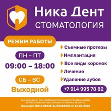 {"arqx0":{"state":{"headerProps":{"form":{"action":"/medicine/clinic/nikadent_127787537727","searchLabel":"Найти","logo":{"href":"//ya.ru","size":44}},"actions":{},"user":{"loggedIn":false,"ariaLabel":"Меню","plus":false,"birthdayHat":false,"child":false,"dialogProps":{"host":"yandex.ru","lang":"ru","project":"medicine","queryParams":{"exp_flags":"skin","preset":"oceania","utm_source":"medicine-app"},"retpath":"https%3A%2F%2Fyandex.ru%2Fmedicine%2Fclinic%2Fnikadent_127787537727%3Fgeov_results%3D1%26lr%3D213%26oid%3Db%253A127787537727%26text%3D%25D0%25BA%25D0%25BB%25D0%25B8%25D0%25BD%25D0%25B8%25D0%25BA%25D0%25B0%26ncrnd%3D39743","tld":"ru","platform":"desktop"},"loginUrl":"https://passport.yandex.ru/auth?retpath=%2F&origin=serp_desktop_auth_new","loginText":"Войти"},"navigation":{"tabs":[{"id":"search","label":"Поиск","url":"//yandex.ru/search","params":{"text":"[$query]","site":"[$site]","source":"tabbar"}},{"id":"search_neuro","label":"Алиса","url":"//yandex.ru/search","params":{"text":"[$query]","site":"[$site]","source":"tabbar","promo":"force_neuro"}},{"id":"medicine","label":"Медицина","url":"//yandex.ru/medicine","params":{"lr":"[$lr]","from":"tabbar"},"target":"_self"},{"id":"images","label":"Картинки","url":"//yandex.ru/images/search","params":{"text":"[$query]","site":"[$site]","noreask":"[$noreask]","nomisspell":"[$nomisspell]","parent-reqid":"[$reqid]","from":"tabbar"}},{"id":"video","label":"Видео","url":"//yandex.ru/video/search","params":{"text":"[$query]","site":"[$site]","noreask":"[$noreask]","parent-reqid":"[$reqid]","from":"tabbar"}},{"id":"maps","label":"Карты","url":"//yandex.ru/maps","params":{"text":"[$query]","source":"serp_navig"}},{"id":"shopping","label":"Товары","url":"//yandex.ru/products","params":{"lr":"[$lr]","from":"tabbar"}},{"id":"translate","label":"Переводчик","url":"//translate.yandex.ru","params":{"text":"[$query]","from":"tabbar"}},{"id":"more","label":"Ещё","url":"//yandex.ru/search","params":{"text":"[$query]","source":"tabbar"},"target":"_self","childTabs":[{"id":"finance","label":"Финансы","url":"//yandex.ru/finance","params":{"lr":"[$lr]","from":"tabbar"}},{"id":"realty","label":"Квартиры","url":"//yandex.ru/realty","params":{"lr":"[$lr]","from":"tabbar"}},{"id":"all","label":"Сервисы Яндекса","url":"//yandex.ru/all","params":{"text":"[$query]","from":"tabbar"}}]}],"selectedTabId":"medicine"},"context":{"query":"Ника Дент","reqid":"1773409835173152-5193830831740842436-balancer-l7leveler-kubr-yp-vla-144-BAL","lr":"213","aliceDeeplink":"{\"text\":\"Ника Дент\"}","counters":{"type":"b","data":{"$header":"arqxz000","logo":"arqxz001","advanced-search":"arqxz002","login":"arqxz004","usermenu":"arqxz005","market-cart":"arqxz007","more-button":"arqxz008","cbir":"arqxz009","clear":"arqxz00a","submit":"arqxz00b","alice":"arqxz00c","favorites":"arqxz00d","$navigation":"arqxz00e","item":"arqxz01p","tab-search":"arqxz014","tab-search_neuro":"arqxz016","tab-medicine":"arqxz018","tab-images":"arqxz01a","tab-video":"arqxz01c","tab-maps":"arqxz01e","tab-shopping":"arqxz01g","tab-translate":"arqxz01i","tab-more":"arqxz01k","tab-finance":"arqxz01m","tab-realty":"arqxz01o","tab-all":"arqxz01q"}}},"loggedIn":false,"mix":{"outerContainer":[]},"suggestUrl":"/medicine/suggest","suggestPlaceholder":"Найти врача, клинику, услугу","suggestParams":{},"utmSources":{"searchableItem":"upper_suggest_text","submitButton":"upper_search_button","enterKey":"upper_suggest_enter"}},"baobab":{"parentNode":{"context":{"genInfo":{"prefix":"arqxw01-0-1"},"ui":"desktop","service":"medicine","fast":{"name":"unisearch/medicine","subtype":"header"}}}}},"type":"unisearch/medicine","subtype":"header"},"arqx1":{"state":{"headerProps":{"title":"Ника Дент","titleSize":"xl","url":"https://nikadent41.ru/","pathItems":[{"text":"nikadent41.ru"}],"schedule":{"title":"Закрыто до понедельника","days":{"mon":{"intervals":[{"from":"09:00","to":"18:00"}]},"tue":{"intervals":[{"from":"09:00","to":"18:00"}]},"wed":{"intervals":[{"from":"09:00","to":"18:00"}]},"thu":{"intervals":[{"from":"09:00","to":"18:00"}]},"fri":{"intervals":[{"from":"09:00","to":"18:00"}],"current":true},"sat":{},"sun":{}},"historySyncId":"org-127787537727-schedule-0"},"siteMetrika":{"type":"reach-goal","metrikaCounterId":"106376576","objectId":"127787537727","objectTitle":"Ника Дент","event":"site","goal":"site"},"blueTitle":true,"reviewsCount":10,"reviewsViewerId":"one-org-modal-card-reviews-127787537727","profileOrgLink":"https://yandex.ru/profile/127787537727?lang=ru","rating":{"value":4.3,"base":5,"decimalSeparator":","},"category":"Стоматологическая клиника"},"tabsProps":{"initialTab":"about","aboutTabProps":{"id":"about","title":"Главное","aboutContentProps":{"galleryProps":{"oid":"127787537727","map":{"height":158,"width":158,"assetId":"ua_34_1922204876","url":"https://yandex.ru/profile/127787537727?lang=ru&no-distribution=1&view-state=mini&source=wizbiz_new_map_single"},"height":158,"isInsidePopup":false,"context":{"type":0,"params":{"tabName":"photo"}},"intent":{"type":2,"params":{"oid":"127787537727","tabName":"photo","subtype":"company"}},"photoTiles":{"items":[{"image":"https://avatars.mds.yandex.net/get-altay/17681761/2a0000019be8d72a0970cb1f1f4e752527cc/L","tagId":"All","name":"Все фото","count":"3","width":281,"height":158,"logNodeAttrs":{"action":"open_photo"}}],"restItems":[{"image":"https://avatars.mds.yandex.net/get-altay/16415892/2a0000019be94565202b05c843afbb35b779/h220","width":158,"height":158,"index":1,"logNodeAttrs":{"action":"open_photo"}}]},"type":"mapAndMedia"},"actionsProps":{"buttons":[{"buttonType":"default","url":"https://nikadent41.ru/","logNode":{"name":"site","attrs":{"action":"site"}},"metrika":{"type":"reach-goal","metrikaCounterId":"106376576","objectId":"127787537727","objectTitle":"Н