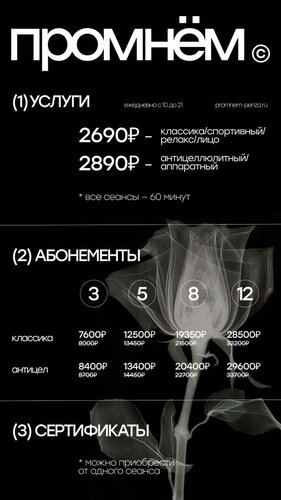 {"ewdw0":{"state":{"headerProps":{"form":{"action":"/medicine/clinic/promnyom_159502727672","searchLabel":"Найти","logo":{"href":"//ya.ru","size":44}},"actions":{},"user":{"loggedIn":false,"ariaLabel":"Меню","plus":false,"birthdayHat":false,"child":false,"dialogProps":{"host":"yandex.ru","lang":"ru","project":"medicine","queryParams":{"exp_flags":"skin","preset":"oceania","utm_source":"medicine-app"},"retpath":"https%3A%2F%2Fyandex.ru%2Fmedicine%2Fclinic%2Fpromnyom_159502727672%3Fgeov_results%3D1%26lr%3D213%26oid%3Db%253A159502727672%26text%3D%25D0%25BA%25D0%25BB%25D0%25B8%25D0%25BD%25D0%25B8%25D0%25BA%25D0%25B0%26ncrnd%3D73968","tld":"ru","platform":"desktop"},"loginUrl":"https://passport.yandex.ru/auth?retpath=%2F&origin=serp_desktop_auth_new","loginText":"Войти"},"navigation":{"tabs":[{"id":"search","label":"Поиск","url":"//yandex.ru/search","params":{"text":"[$query]","site":"[$site]","source":"tabbar"}},{"id":"search_neuro","label":"Алиса","url":"//yandex.ru/search","params":{"text":"[$query]","site":"[$site]","source":"tabbar","promo":"force_neuro"}},{"id":"medicine","label":"Медицина","url":"//yandex.ru/medicine","params":{"lr":"[$lr]","from":"tabbar"},"target":"_self"},{"id":"images","label":"Картинки","url":"//yandex.ru/images/search","params":{"text":"[$query]","site":"[$site]","noreask":"[$noreask]","nomisspell":"[$nomisspell]","parent-reqid":"[$reqid]","from":"tabbar"}},{"id":"video","label":"Видео","url":"//yandex.ru/video/search","params":{"text":"[$query]","site":"[$site]","noreask":"[$noreask]","parent-reqid":"[$reqid]","from":"tabbar"}},{"id":"maps","label":"Карты","url":"//yandex.ru/maps","params":{"text":"[$query]","source":"serp_navig"}},{"id":"shopping","label":"Товары","url":"//yandex.ru/products","params":{"lr":"[$lr]","from":"tabbar"}},{"id":"finance","label":"Финансы","url":"//yandex.ru/finance","params":{"lr":"[$lr]","from":"tabbar"}},{"id":"realty","label":"Квартиры","url":"//yandex.ru/realty","params":{"lr":"[$lr]","from":"tabbar"}},{"id":"translate","label":"Переводчик","url":"//translate.yandex.ru","params":{"text":"[$query]","from":"tabbar"}},{"id":"all","label":"Все","url":"//yandex.ru/all","params":{"text":"[$query]","from":"tabbar"}}],"selectedTabId":"medicine"},"context":{"query":"Промнём","reqid":"1770594110293953-11290932854368562955-balancer-l7leveler-kubr-yp-klg-242-BAL","lr":"213","aliceDeeplink":"{\"text\":\"Промнём\"}","counters":{"type":"b","data":{"$header":"ewdwz000","logo":"ewdwz001","advanced-search":"ewdwz002","login":"ewdwz004","usermenu":"ewdwz005","market-cart":"ewdwz007","more-button":"ewdwz008","cbir":"ewdwz009","clear":"ewdwz00a","submit":"ewdwz00b","alice":"ewdwz00c","favorites":"ewdwz00d","$navigation":"ewdwz00e","item":"ewdwz01l","tab-search":"ewdwz012","tab-search_neuro":"ewdwz014","tab-medicine":"ewdwz016","tab-images":"ewdwz018","tab-video":"ewdwz01a","tab-maps":"ewdwz01c","tab-shopping":"ewdwz01e","tab-finance":"ewdwz01g","tab-realty":"ewdwz01i","tab-translate":"ewdwz01k","tab-all":"ewdwz01m"}}},"loggedIn":false,"mix":{"outerContainer":[]},"suggestUrl":"/medicine/suggest","suggestPlaceholder":"Найти врача, клинику, услугу","suggestParams":{}},"baobab":{"parentNode":{"context":{"genInfo":{"prefix":"ewdww01-0-1"},"ui":"desktop","service":"medicine","fast":{"name":"unisearch/medicine","subtype":"header"}}}}},"type":"unisearch/medicine","subtype":"header"},"ewdw1":{"state":{"headerProps":{"title":"Промнём","titleSize":"xl","url":"https://promnem-penza.ru/","pathItems":[{"text":"promnem-penza.ru"}],"schedule":{"title":"Закрыто до 10:00","days":{"mon":{"intervals":[{"from":"10:00","to":"21:00"}],"current":true},"tue":{"intervals":[{"from":"10:00","to":"21:00"}]},"wed":{"intervals":[{"from":"10:00","to":"21:00"}]},"thu":{"intervals":[{"from":"10:00","to":"21:00"}]},"fri":{"intervals":[{"from":"10:00","to":"21:00"}]},"sat":{"intervals":[{"from":"10:00","to":"21:00"}]},"sun":{"intervals":[{"from":"10:00","to":"21:00"}]}},"historySyncId":"org-159502727672-schedule-0"},"logo":"https://avatars.mds.yandex.net/get-altay/15344725/2a000001994d9b740c5bee41c9c9d6c4827c/XS","siteMetrika":{"type":"reach-goal","metrikaCounterId":"87608855","objectId":"159502727672","objectTitle":"Промнём","event":"site","goal":"site"},"blueTitle":true,"reviewsCount":265,"reviewsViewerId":"one-org-modal-card-reviews-159502727672","profileOrgLink":"https://yandex.ru/profile/159502727672?lang=ru","rating":{"value":5,"base":5,"decimalSeparator":","},"category":"Салон красоты","verifiedTld":"ru"},"tabsProps":{"initialTab":"about","aboutTabProps":{"id":"about","title":"Главное","aboutContentProps":{"galleryProps":{"oid":"159502727672","map":{"height":158,"width":158,"assetId":"ua_34_3556942707","url":"https://yandex.ru/profile/159502727672?lang=ru&no-distribution=1&view-state=mini&source=wizbiz_new_map_single"},"height":158,"isInsidePopup":false,"context":{"type":0,"params":{"tabName":"photo"}},"intent":{"type":2,"params":{"oid":"159502727672","tabName":"photo","subtype":"company"}},"photoTiles":{"items":[{"image":"https://avatars.mds.yandex.net/get-altay/6410060/2a00000181aa4d77e839f75cd4234ebf537e/L","tagId":"All","name":"Все фото","count":"147","width":130,"height":158,"logNodeAttrs":{"action":"open_photo"}},{"image":"https://avatars.mds.yandex.net/get-altay/8072647/2a000001845cb6fbc7bacec3f7808796ddfe/L","tagId":"Exterior","name":"Снаружи","count":"14","width":211,"height":158,"logNodeAttrs":{"action":"open_photo"}},{"image":"https://avatars.mds.yandex.net/get-altay/5445147/2a00000180d6d717ef4c590af234c531a14b/L","tagId":"Interior","name":"Внутри","count":"71","width":130,"height":158,"logNodeAttrs":{"action":"open_photo"}},{"image":"https://avatars.mds.yandex.net/get-altay/6222916/2a00000180fab53e86161768d56d3027ccef/L","tagId":"Enter","name":"Вход","count":"3","width":130,"height":