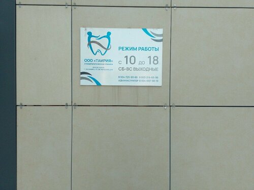 {"e3bq0":{"state":{"headerProps":{"form":{"action":"/medicine/clinic/tairiya_136244398100","searchLabel":"Найти","logo":{"href":"//ya.ru","size":44}},"actions":{},"user":{"loggedIn":false,"ariaLabel":"Меню","plus":false,"birthdayHat":false,"child":false,"dialogProps":{"host":"yandex.ru","lang":"ru","project":"medicine","queryParams":{"exp_flags":"skin","preset":"oceania","utm_source":"medicine-app"},"retpath":"https%3A%2F%2Fyandex.ru%2Fmedicine%2Fclinic%2Ftairiya_136244398100%3Fgeov_results%3D1%26lr%3D213%26oid%3Db%253A136244398100%26text%3D%25D0%25BA%25D0%25BB%25D0%25B8%25D0%25BD%25D0%25B8%25D0%25BA%25D0%25B0%26ncrnd%3D26543","tld":"ru","platform":"desktop"},"loginUrl":"https://passport.yandex.ru/auth?retpath=%2F&origin=serp_desktop_auth_new","loginText":"Войти"},"navigation":{"tabs":[{"id":"search","label":"Поиск","url":"//yandex.ru/search","params":{"text":"[$query]","site":"[$site]","source":"tabbar"}},{"id":"search_neuro","label":"Алиса","url":"//yandex.ru/search","params":{"text":"[$query]","site":"[$site]","source":"tabbar","promo":"force_neuro"}},{"id":"medicine","label":"Медицина","url":"//yandex.ru/medicine","params":{"lr":"[$lr]","from":"tabbar"},"target":"_self"},{"id":"images","label":"Картинки","url":"//yandex.ru/images/search","params":{"text":"[$query]","site":"[$site]","noreask":"[$noreask]","nomisspell":"[$nomisspell]","parent-reqid":"[$reqid]","from":"tabbar"}},{"id":"video","label":"Видео","url":"//yandex.ru/video/search","params":{"text":"[$query]","site":"[$site]","noreask":"[$noreask]","parent-reqid":"[$reqid]","from":"tabbar"}},{"id":"maps","label":"Карты","url":"//yandex.ru/maps","params":{"text":"[$query]","source":"serp_navig"}},{"id":"shopping","label":"Товары","url":"//yandex.ru/products","params":{"lr":"[$lr]","from":"tabbar"}},{"id":"finance","label":"Финансы","url":"//yandex.ru/finance","params":{"lr":"[$lr]","from":"tabbar"}},{"id":"realty","label":"Квартиры","url":"//yandex.ru/realty","params":{"lr":"[$lr]","from":"tabbar"}},{"id":"translate","label":"Переводчик","url":"//translate.yandex.ru","params":{"text":"[$query]","from":"tabbar"}},{"id":"all","label":"Все","url":"//yandex.ru/all","params":{"text":"[$query]","from":"tabbar"}}],"selectedTabId":"medicine"},"context":{"query":"Таирия","reqid":"1768978100280163-3600114751495008500-balancer-l7leveler-kubr-yp-vla-122-BAL","lr":"213","aliceDeeplink":"{\"text\":\"Таирия\"}","counters":{"type":"b","data":{"$header":"e3bqz000","logo":"e3bqz001","advanced-search":"e3bqz002","login":"e3bqz004","usermenu":"e3bqz005","market-cart":"e3bqz007","more-button":"e3bqz008","cbir":"e3bqz009","clear":"e3bqz00a","submit":"e3bqz00b","alice":"e3bqz00c","$navigation":"e3bqz00d","item":"e3bqz01k","tab-search":"e3bqz011","tab-search_neuro":"e3bqz013","tab-medicine":"e3bqz015","tab-images":"e3bqz017","tab-video":"e3bqz019","tab-maps":"e3bqz01b","tab-shopping":"e3bqz01d","tab-finance":"e3bqz01f","tab-realty":"e3bqz01h","tab-translate":"e3bqz01j","tab-all":"e3bqz01l"}}},"loggedIn":false,"mix":{"outerContainer":[]},"suggestUrl":"/medicine/suggest","suggestPlaceholder":"Найти врача, клинику, услугу","suggestParams":{}},"baobab":{"parentNode":{"context":{"genInfo":{"prefix":"e3bqw01-0-1"},"ui":"desktop","service":"medicine","fast":{"name":"unisearch/medicine","subtype":"header"}}}}},"type":"unisearch/medicine","subtype":"header"},"e3bq1":{"state":{"headerProps":{"title":"Таирия","titleSize":"xl","schedule":{"title":"Открыто до 18:00","days":{"mon":{"intervals":[{"from":"10:00","to":"18:00"}]},"tue":{"intervals":[{"from":"10:00","to":"18:00"}]},"wed":{"intervals":[{"from":"10:00","to":"18:00"}],"current":true},"thu":{"intervals":[{"from":"10:00","to":"18:00"}]},"fri":{"intervals":[{"from":"10:00","to":"18:00"}]},"sat":{},"sun":{}},"historySyncId":"org-136244398100-schedule-0"},"blueTitle":true,"reviewsViewerId":"one-org-modal-card-reviews-136244398100","profileOrgLink":"https://yandex.ru/profile/136244398100?lang=ru","category":"Стоматологическая клиника"},"tabsProps":{"initialTab":"about","aboutTabProps":{"id":"about","title":"Главное","aboutContentProps":{"galleryProps":{"oid":"136244398100","map":{"height":158,"width":158,"assetId":"ua_34_2496117060","url":"https://yandex.ru/profile/136244398100?lang=ru&no-distribution=1&view-state=mini&source=wizbiz_new_map_single"},"height":158,"isInsidePopup":false,"context":{"type":0,"params":{"tabName":"photo"}},"intent":{"type":2,"params":{"oid":"136244398100","tabName":"photo","subtype":"company"}},"photoTiles":{"items":[{"image":"https://avatars.mds.yandex.net/get-altay/16478002/2a0000019a65c71f5127664e53fb2cf764da/L","tagId":"All","name":"Все фото","count":"7","width":211,"height":158,"logNodeAttrs":{"action":"open_photo"}},{"image":"https://avatars.mds.yandex.net/get-altay/16374562/2a0000019a65be250d2c0165c61edfa7583a/L","tagId":"Exterior","name":"Снаружи","count":"3","width":211,"height":158,"logNodeAttrs":{"action":"open_photo"}},{"image":"https://avatars.mds.yandex.net/get-altay/16166099/2a0000019a65bb36878b11ac05f339b32c74/L","tagId":"Enter","name":"Вход","count":"3","width":211,"height":158,"logNodeAttrs":{"action":"open_photo"}}],"restItems":[{"image":"https://avatars.mds.yandex.net/get-altay/16368192/2a0000019a65ca9c56308c2da90ee2a66177/h220","width":211,"height":158,"index":3,"logNodeAttrs":{"action":"open_photo"}},{"image":"https://avatars.mds.yandex.net/get-altay/10228783/2a00000193ec3165560968c8f37b5ca23bfd/h220","width":211,"height":158,"index":4,"logNodeAttrs":{"action":"open_photo"}},{"image":"https://avatars.mds.yandex.net/get-altay/14190752/2a00000193eb06065a1d8513ffee6601c728/h220","width":211,"height":158,"index":5,"logNodeAttrs":{"action":"open_photo"}}]},"type":"mapAndMedia"},"actionsProps":{"buttons":[{"buttonType":"default","url":"https://yandex.ru/profile/136244398100?lang=ru&source=wi