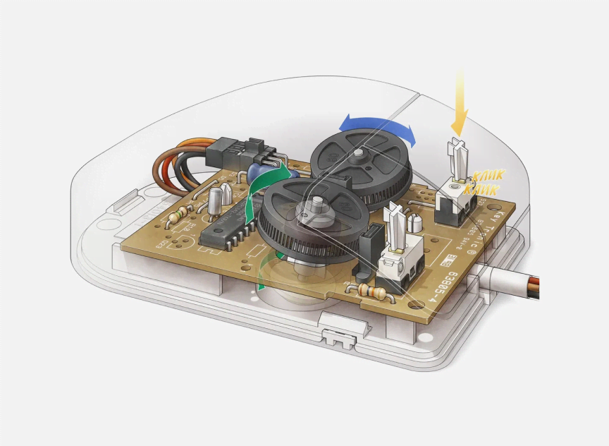 В основании мыши закреплены два вращающихся диска, каждый — почти параллельно столу, под совсем небольшим углом. Углы выбраны так, чтобы при движении мыши от себя вращался только первый диск, а при движении вправо и влево — только второй. То есть диски отвечают за движение курсора по вертикали и горизонтали соответственно.