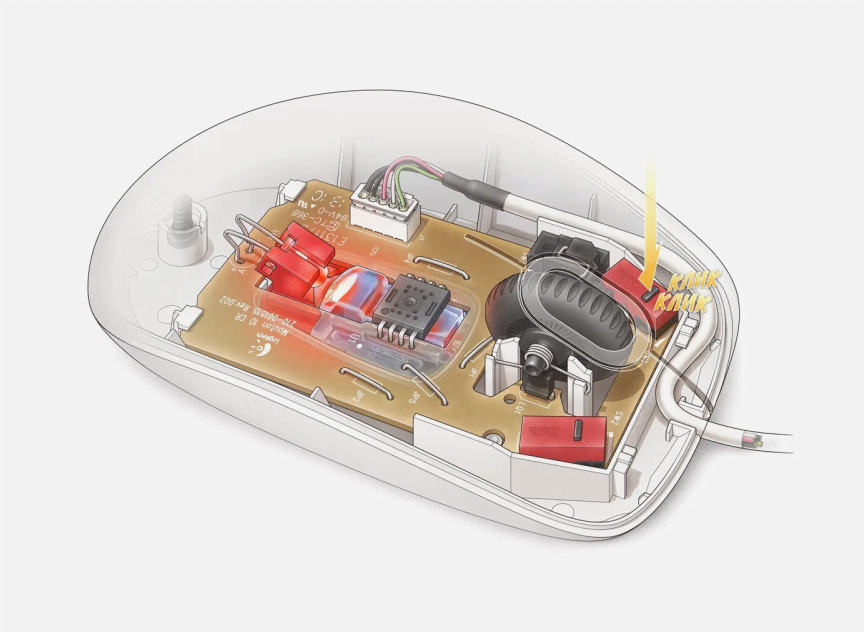 В специальном отсеке у основания мыши расположен шарик — он касается стола сквозь круглое отверстие. Поэтому, когда вы перемещаете мышь, шарик вращается — и вращает два валика по бокам. Валики прикреплены к колёсикам, на которые смотрят оптические датчики, регистрирующие движение.