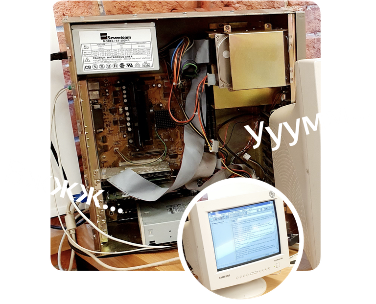 Концептуальный звук от советского IBM PC/XT-совместимого компьютера — с писком динамика после запуска игры Arkanoid и характерным треском магнитных головок жёсткого диска во время выключения