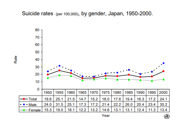 11) Evolution 1950-2000 of global suicide rates (per 100'000). Suicide rates (per 100,000), by gender, Japan, 1950-2000.. — Текст : электронный // World Health Organization : [сайт]. — URL: https://www.who.int/mental_health/media/en/327.pdf (дата обращения: 22.02.2022).