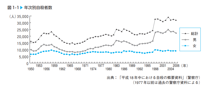 1) Мы обращаемся к брошюре (руководству) Министерства здравоохранения, труда и благосостояния Японии 2007 года: «職場における。自殺の予防と対応» [«На рабочем месте. Предотвращение самоубийств и реагирование на них»]. И, действительно, ежегодная тенденция самоубийств в Японии с 1950 по 2006 гг., демонтирует на графике нам то, что 1-е пиковое значение самоубийств все-таки приходится на 1958 год.