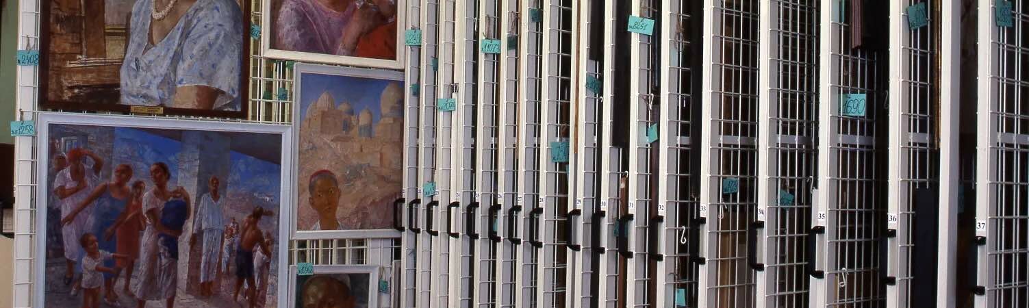 Так, как я соблюдаю нормы хранения своих картин, вероятно и является правильным. Продвинутые в искусстве коллеги могут меня поправить. Оговорюсь сразу, здесь я имею в виду живопись на подрамниках. Живопись, снятая с подрамников у меня скатана в рулон на картонный вал-трубку картинным слоем НАРУЖУ. Живопись же на подрамниках ставим вертикально лицевой (картинной) стороной друг ко другу, соблюдая совпадения ширины подрамников, не допуская того, чтобы какая-нибудь из картин не провисала и не давила на холст своей соседки уголком своего подрамника. Здесь есть большой риск того, что возникнет незаживающая вмятина, которую выровнять очень трудно, но можно. Года три назад я приобрел пару чудесных стеллажей, которые соединил в одну линию. Комната (здесь я и живу), конечно, здорово сократилась в свободном пространстве, но, творчество продолжается. Раньше у меня для хранения картин была широкая полка-антресоль, которая была перекинута между стеной и верхом шифанера, образуя внизу уютную нишу, где стоял мой письменный стол с компьютером. Было в комнате гораздо просторнее чем сейчас, но, с течением времени работам стало тесновато там. От пыли, которая здесь полновластная хозяйка, картины необходимо, все-таки, накрывать сверху какой-нибудь тканью, типа портьеры, если нет возможности протянуть занавеску. Хранение застекленной графики в заданную тему не входит, это геморрой отдельный, но одно нужно твердо сказать, что для этого должна быть особо выделенная полка (место хранения). Хранить все в одной куче чревато очень серьезным повреждением рук самого художника. Не застекленную графику лучше всего хранить в папках,