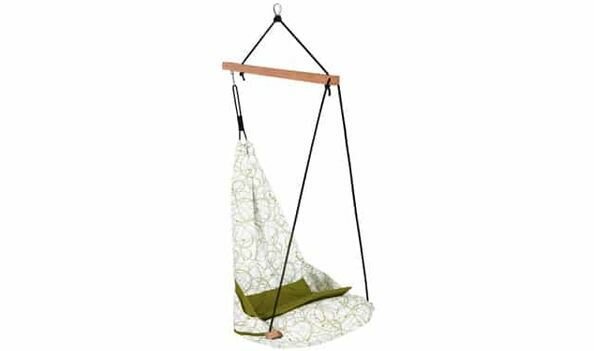 Это гамак для сидения или также называемый подвесным креслом. Может использоваться только одним человеком с максимальным весом до 150 кг. Длина 55 см, ширина 48 см. Дизайн выполнен в белом и зеленом цветах.