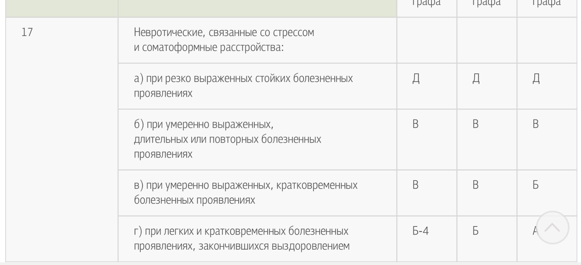 Статья 17 расписания болезней предусматривает реактивные психозы, невротические, диссоциативные и соматоформные расстройства, психогенные депрессивные состояния и реакции, невротическое развитие личности, а так же расстройства адаптации.