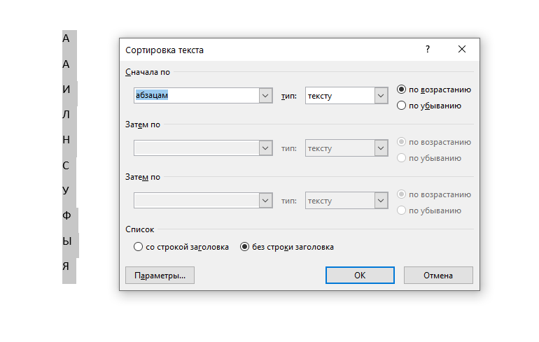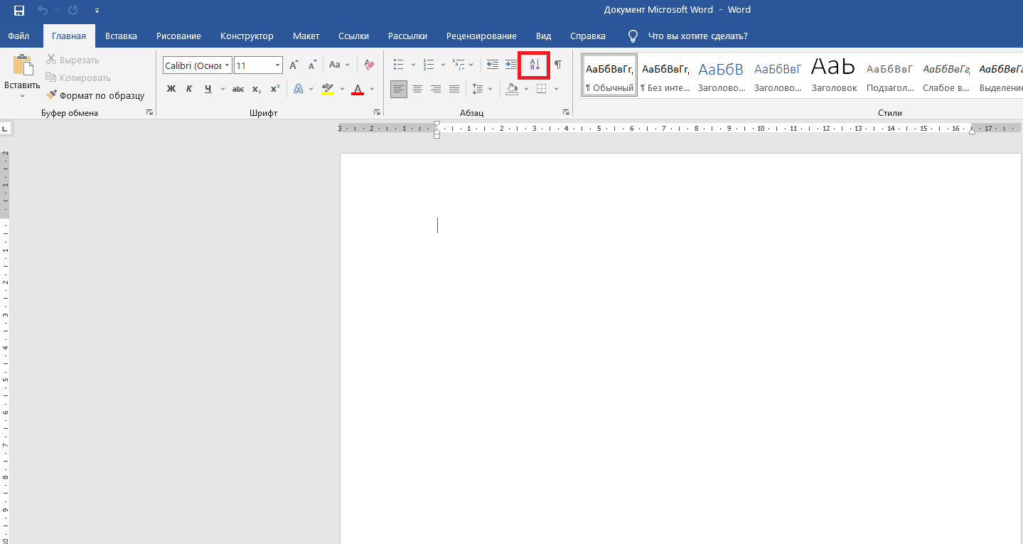 3)На главной вкладке в разделе «Абзац» нажмите кнопку «Сортировка». Значок имеет букву «А» над буквой «Я» со стрелкой, направленной сверху вниз. Откроется диалоговое окно «Сортировка текста».