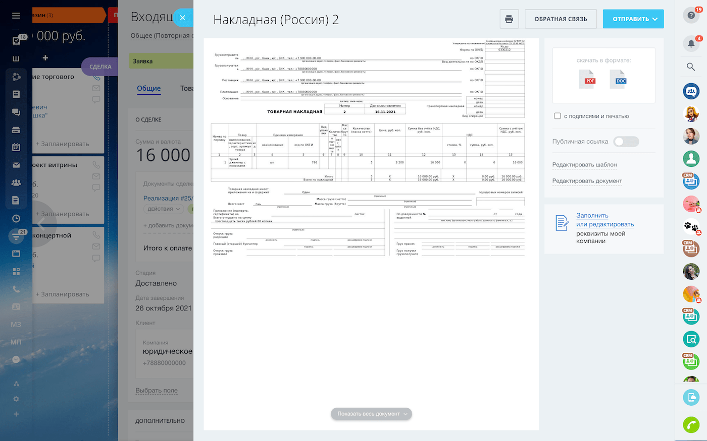 Складской учёт уже интегрирован с CRM. Прямо из сделки менеджер отдела продаж резервирует товар для покупателя, готовит накладные, выставляет счет и отправляет его клиенту.