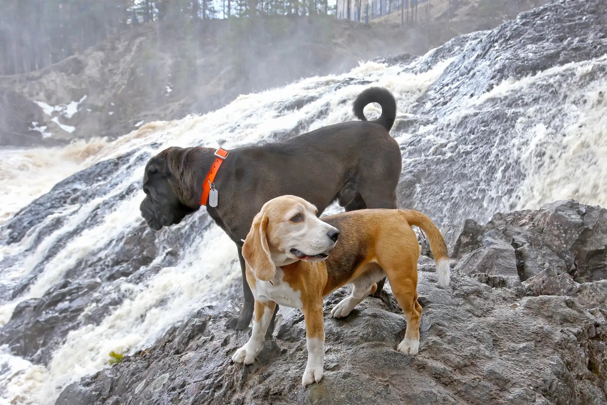 Сейчас осушенная часть русла реки используется для водосброса. Шлюзы плотины открывают и воду спускают, когда водохранилище переполняется. Случается такой бурный поток раз в несколько лет после паводка. Говорят, нам очень повезло его увидеть. И услышать! Поверьте, шум водопада слышен по всему поселку. Нам так и посоветовали - идти на шум воды. Реки Карелии в этом году весьма полноводны весной. А большую часть времени в течение года вулканические породы вулкана на месте бывшего течения реки как раз осушены и доступны для наблюдения. И это повод приехать сюда еще. Большую часть года водопад Гирвас представляет собой каменный склон, по ступеням которого бежит небольшой ручей, превращающийся в некоторых местах в озерца. Словом, поток-то мы увидели, а вот древний кратер - нет, его заполнила вода. Крокодилы с удовольствием гуляли на камнях древнего вулкана. Удивительно, насколько Майк любит воду и совсем не боится потока и шума водопада. А Рюрь ходил с опаской. И для справки: именно на Суне расположены три некогда самых известных карельских падуна - Гирвас, Кивач и Поор-порог. Еще полтора столетия назад водопад Гирвас (тот, природный, а не этот искусственный у ГЭС), как и оба его собрата, считались жемчужинами Олонецкой губернии. Каскад состоял из двух мощных стремнин, падавших с высоты более 10 метров. Чуть ниже поток преодолевал еще два меньших по величине порога. Общая высота каскада составляла 15 метров. Сегодня все чаще забывают про старый водопад и Гирвасом называют водосброс Пальеозерской ГЭС. Впрочем, это вполне заслужено. Новый водопад Гирвас превзошел своего дедушку по всем показателям.