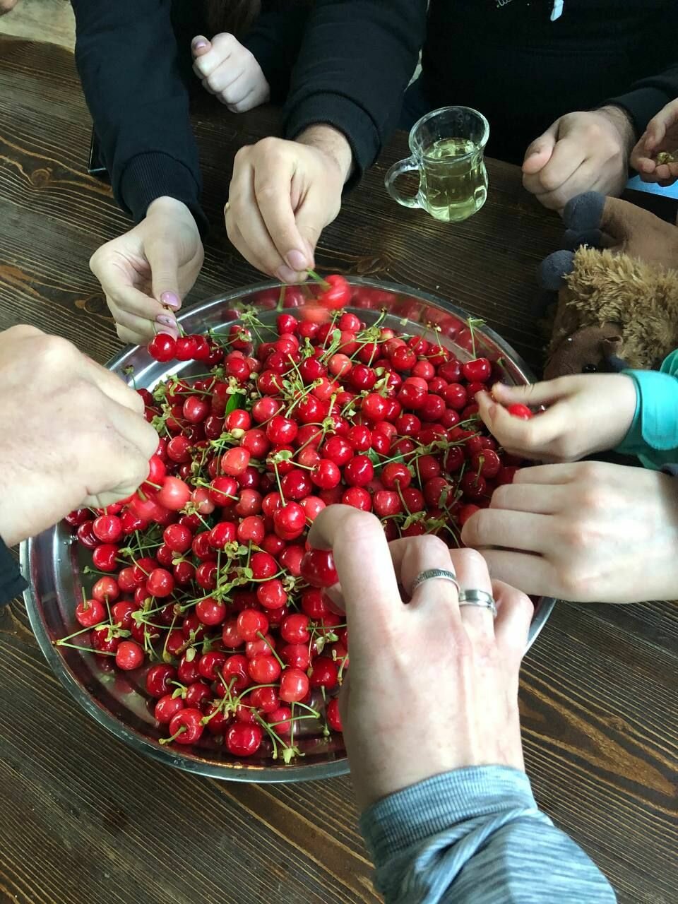 Немного про еду и проживание: мы жили на базе со всеми удобствами и там же нас и кормили завтраком и ужином. В Дагестане принято есть много мяса, например шашлык, плов, жаркое. Также местным блюдом считается чуду: лепешка с сыром, творогом и зеленью, Мясом. На завтрак было лакомством попробовать кашу из абрикоса с урбечем, такого нигде не встретить. Урбеч это паста из косточек или сухофруктов, но в Дагестане она была самой вкусной. По гостеприимству: в Дагестане отдадут гостю последнюю еду или кров, но главное чтоб гость был в сытости. На фото наш гид позвал к себе в сад, чтоб мы нарвали только поспевшую черешню.