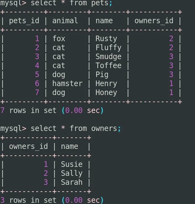 Чтобы узнать, у кого какие домашние животные, мы должны соединить две таблицы вместе следующим образом: