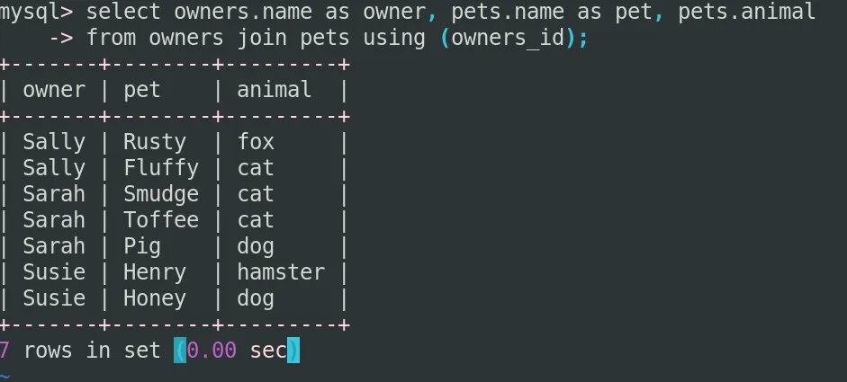 В приведенном выше примере используется ключевое слово ON, но поскольку столбцы, которые мы используем для объединения, называются owner_id в обеих таблицах, вместо этого мы можем использовать USING в качестве сокращения.