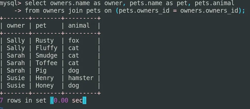 mysql> select owners.name as owner, pets.name as pet, pets.animal