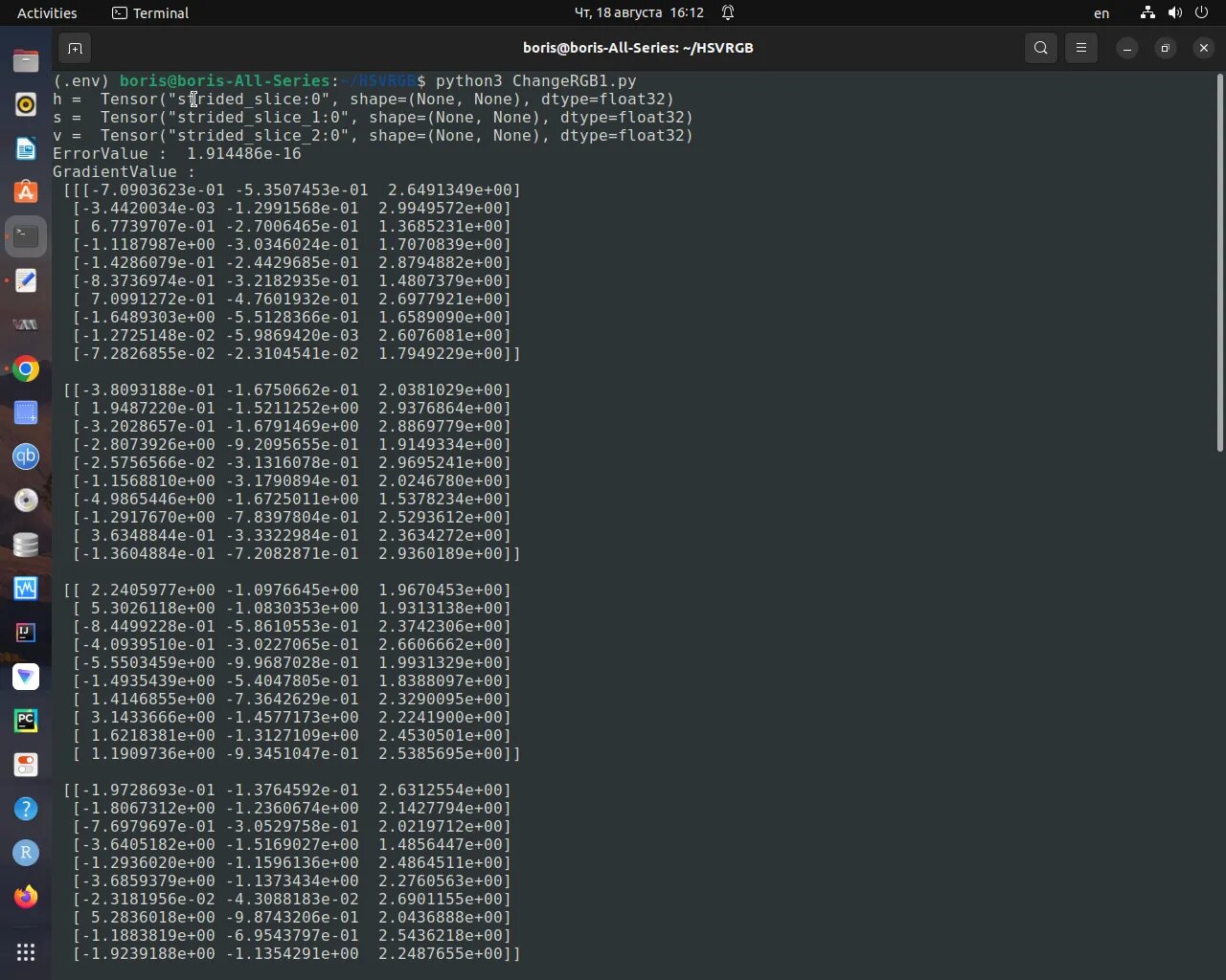 Обратите внимание, что преобразование HSV в RGB не является непрерывной функцией , что, возможно, является причиной отсутствия определенного градиента. Это означает, что градиенты не всегда могут указывать правильное направление оптимизации из-за «скачков» в определении преобразования.