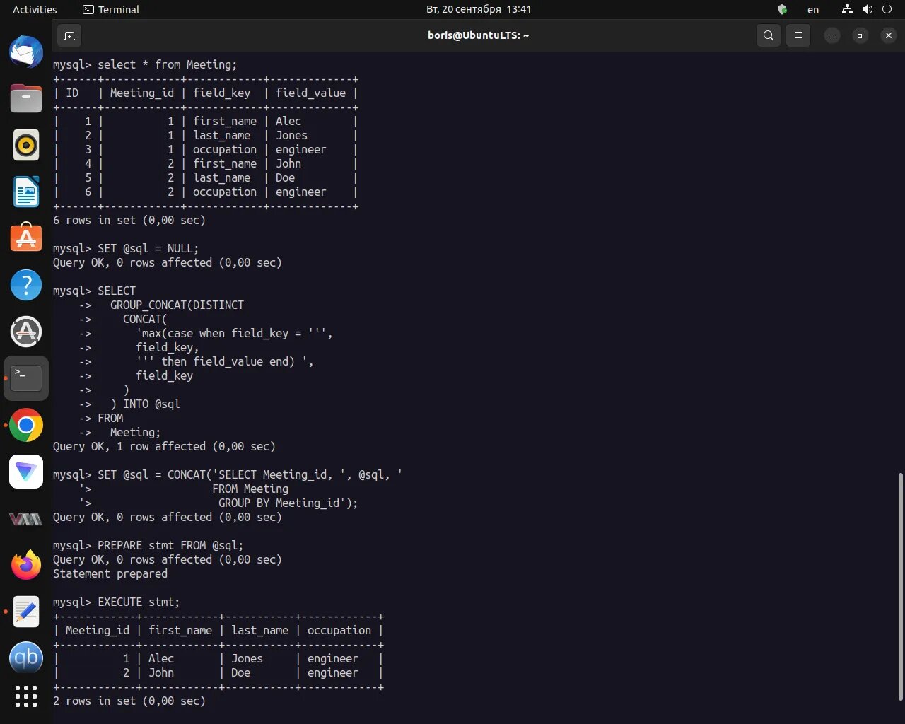 mysql> SET @sql = CONCAT('SELECT Meeting_id, ', @sql, '