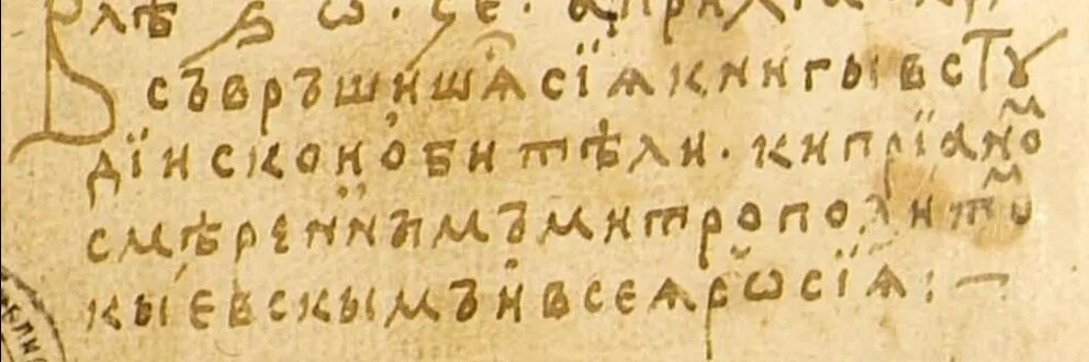Если верить Википедии, то первое известное упоминание слова "Россия" кириллицей — это надпись на последней странице Лествицы Иоанна Синайского, переписанной митрополитом Киприаном: «В лето 6895 [1387], априлиа 24, съвръшишяся сия книгы в Студийской обители Киприаном смереннымъ митрополитом Кыевскымъ и всея Росия»