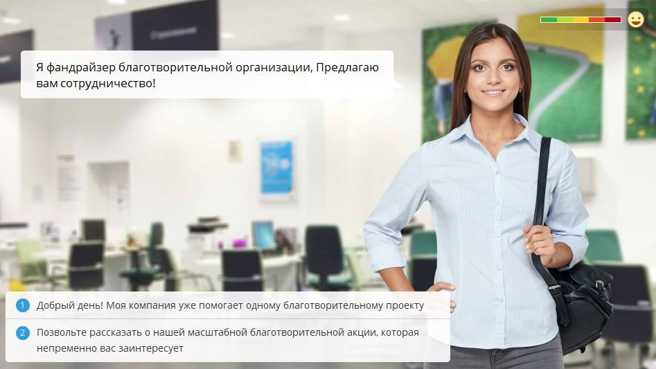 Диалоговые тренажёры помогают людям овладеть навыками коммуникации в виртуальной среде, чтобы в реальной жизни не сорвать, например, сделку или не испортить отношения с клиентом. Cм. пример ниже диалогового тренажёра.