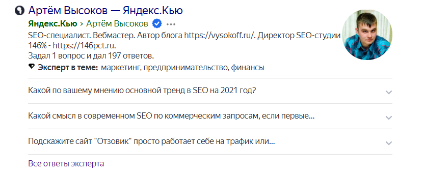 Если, например, вы оказываете какие-либо услуги и потенциальный заказчик захочет "пробить" вас как специалиста, такие вещи как Яндекс.Кью помогут ему понять вашу компетентность, а значит увеличат его лояльность и продать свою услугу такому человеку будет многократно проще.