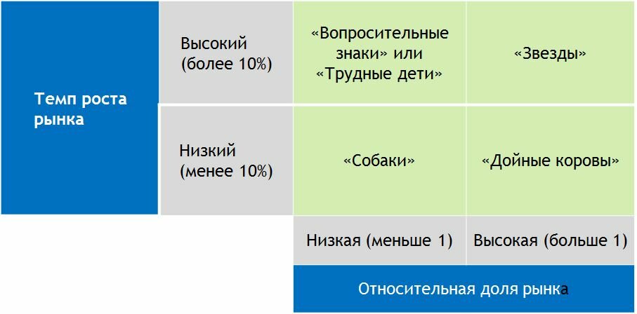 Если об этом не забывать, то получается, что если наша продукция находится на рынке с низким ростом, то всё что у нас есть это "дойные коровы" и "собаки" и наоборот при росте рынка у нас "сплошные звезды" и "вопросительные знаки". Явный бред.