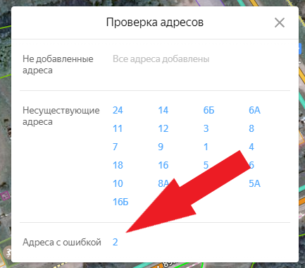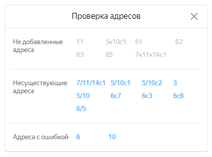 Как только введёте все номера домов, нажмите Проверить, появиться результат проверки, который содержим номера домов, при наведении на них будет отображено полное название адреса. По номерам, которые подсвечены синим можно перейти в карточку объекта адреса