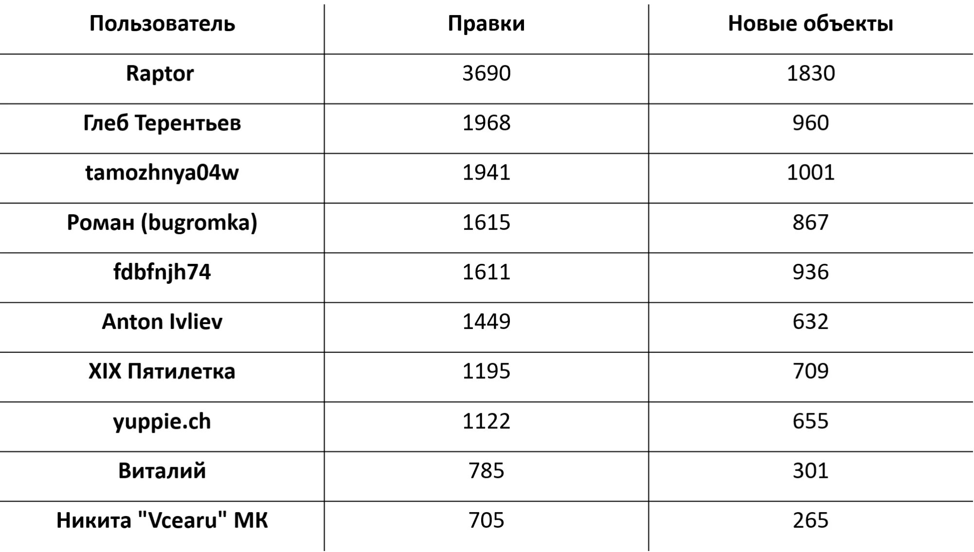 Как я уже писал выше, в этом совреде приняли участие невероятные 91 человек. Совместными усилиями они сделали 21122 правки, из которых 10469 – новые объекты.