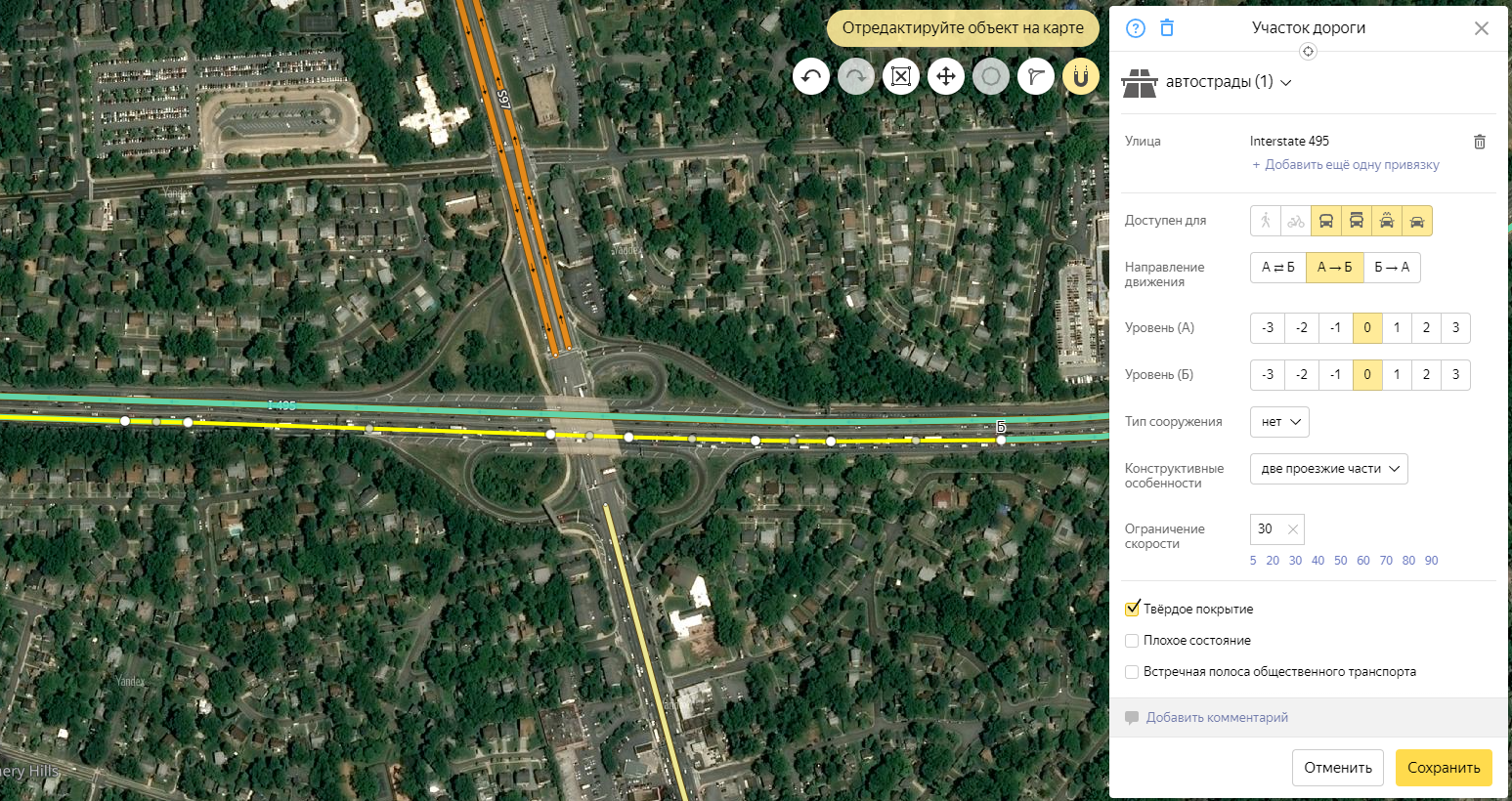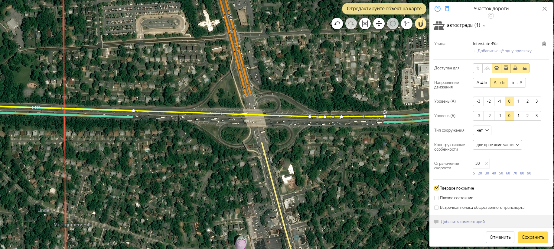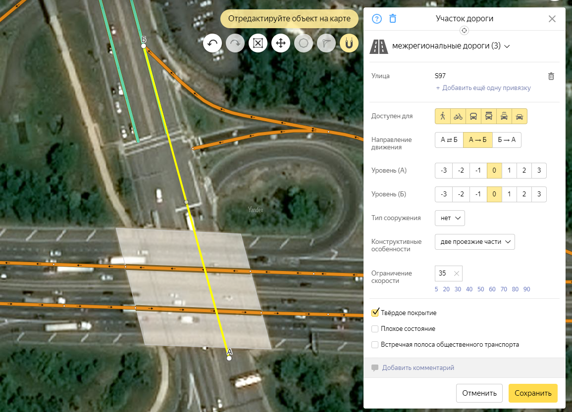 Не забудем проверить привязку улицы, класс, конструктивные особенности и ограничение скорости.