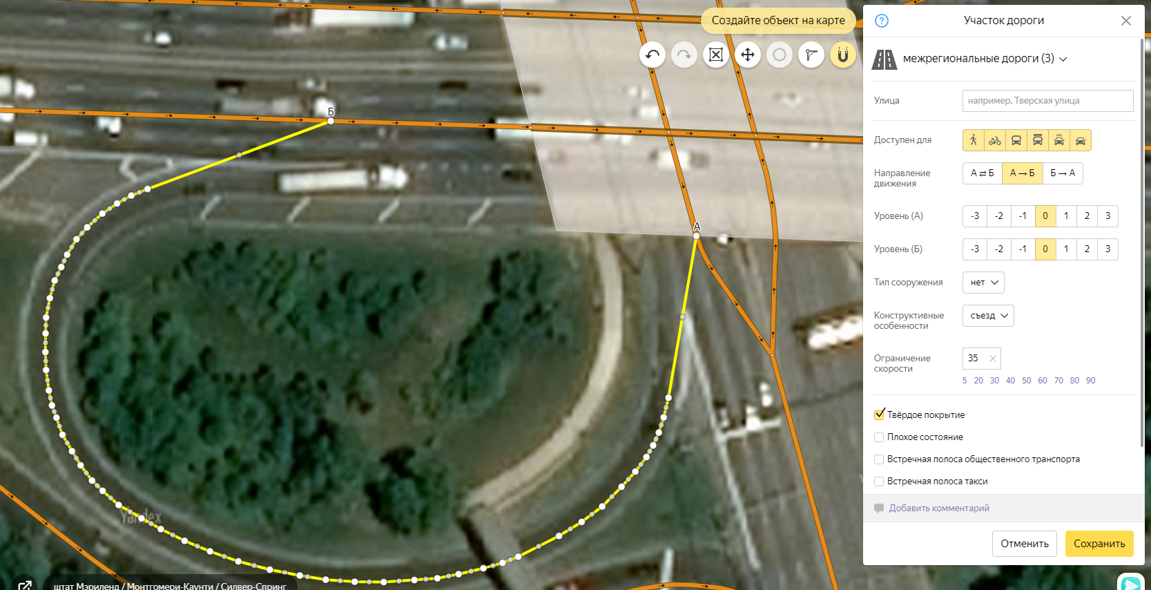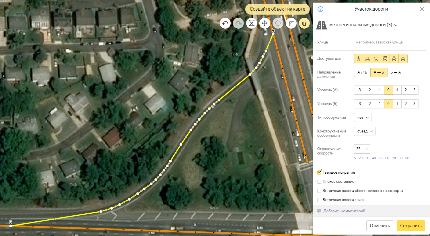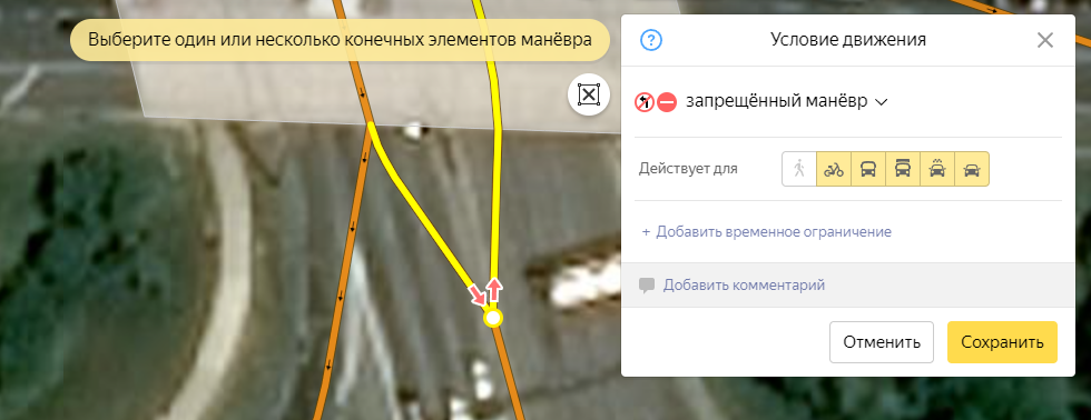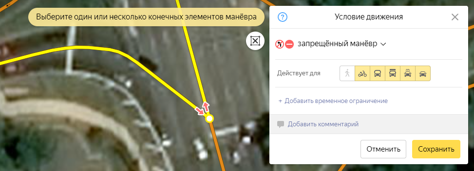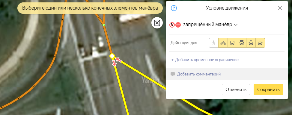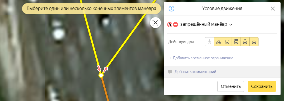 ⛔️ Запрещенные маневры необходимы для того, чтобы Яндекс.Карты не строили несуществующие маршруты через сплошную разметку или там, где это запрещено знаками. Поэтому это один из важных шагов при рисовании в слое «Дороги».