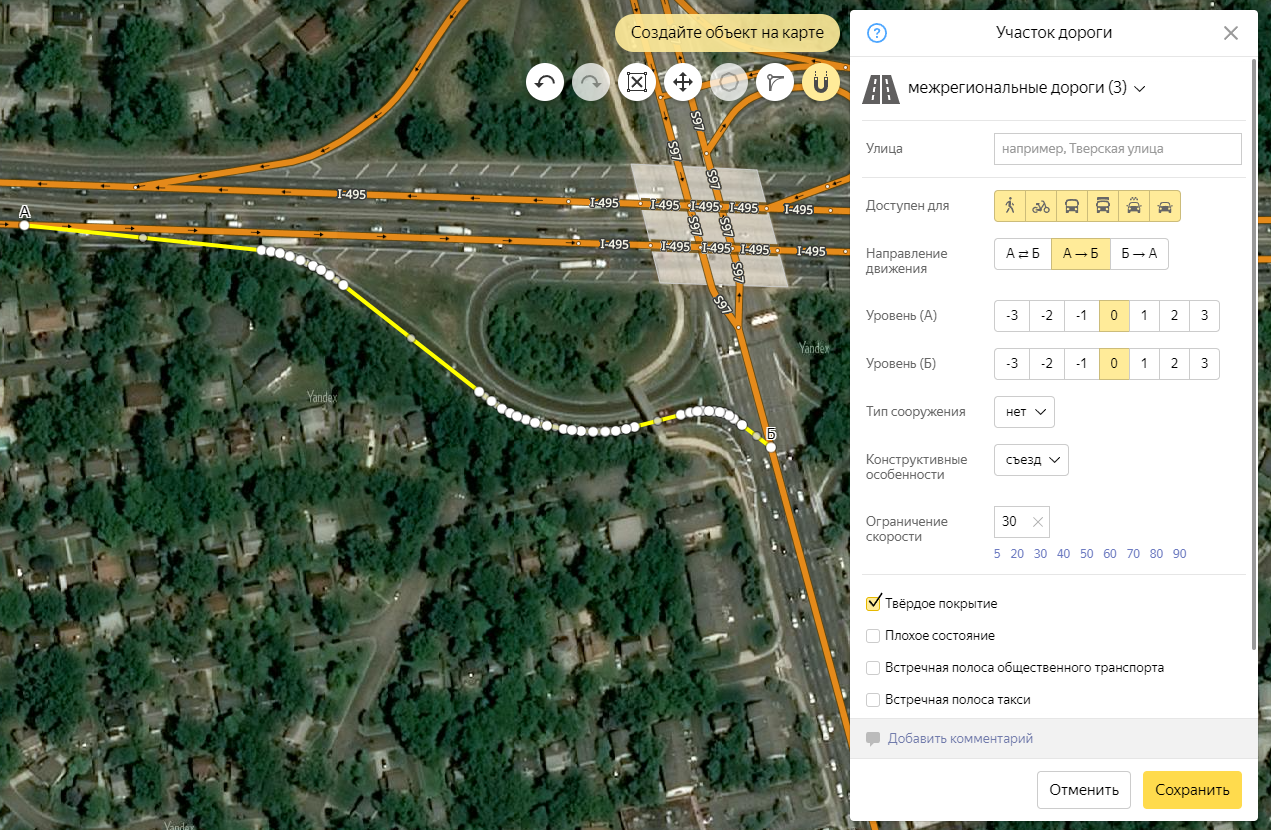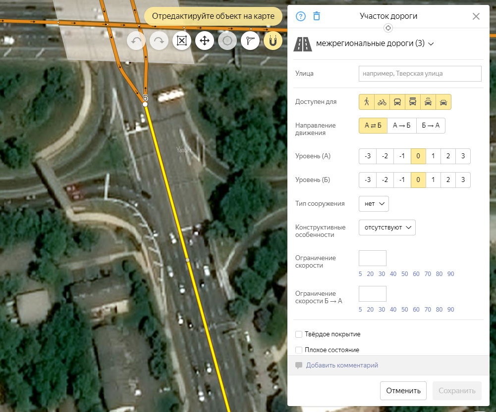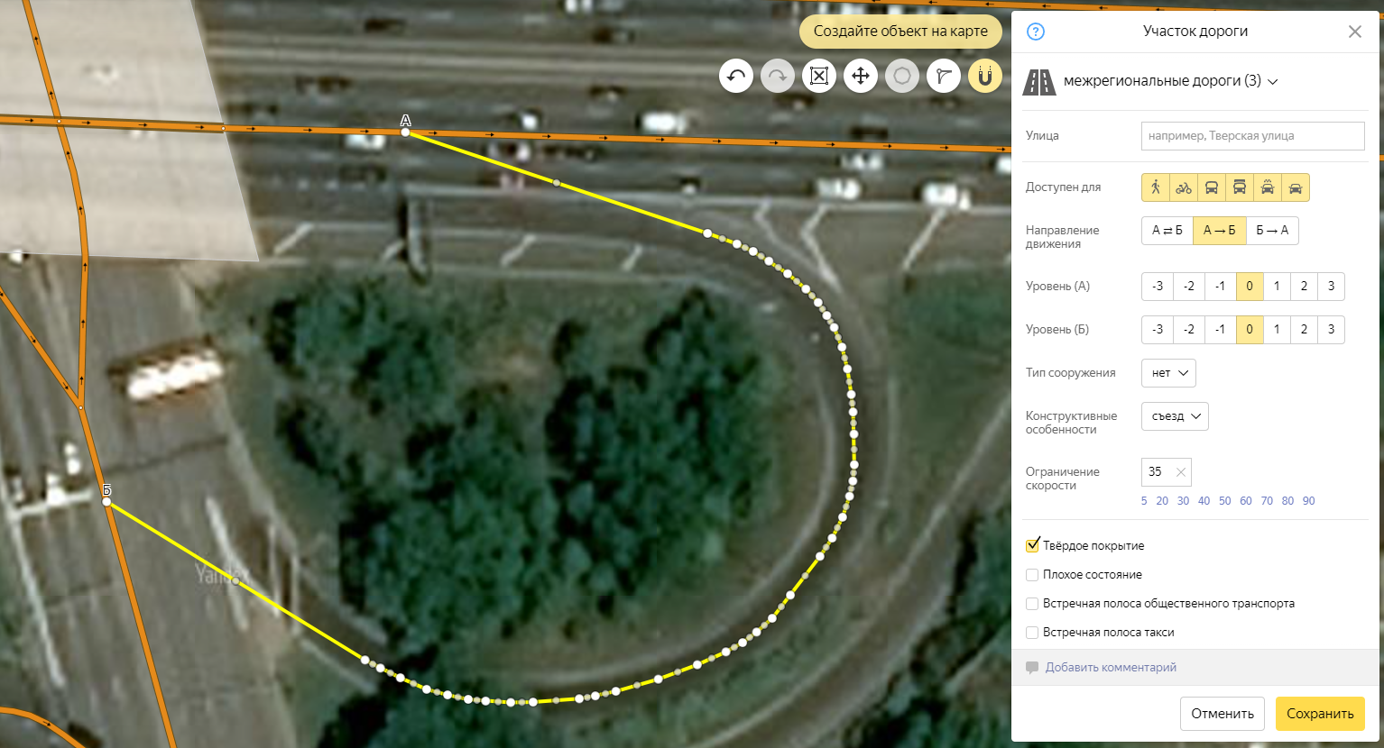 ⛔️ Запрещенные маневры необходимы для того, чтобы Яндекс.Карты не строили несуществующие маршруты через сплошную разметку или там, где это запрещено знаками. Поэтому это один из важных шагов при рисовании в слое «Дороги».
