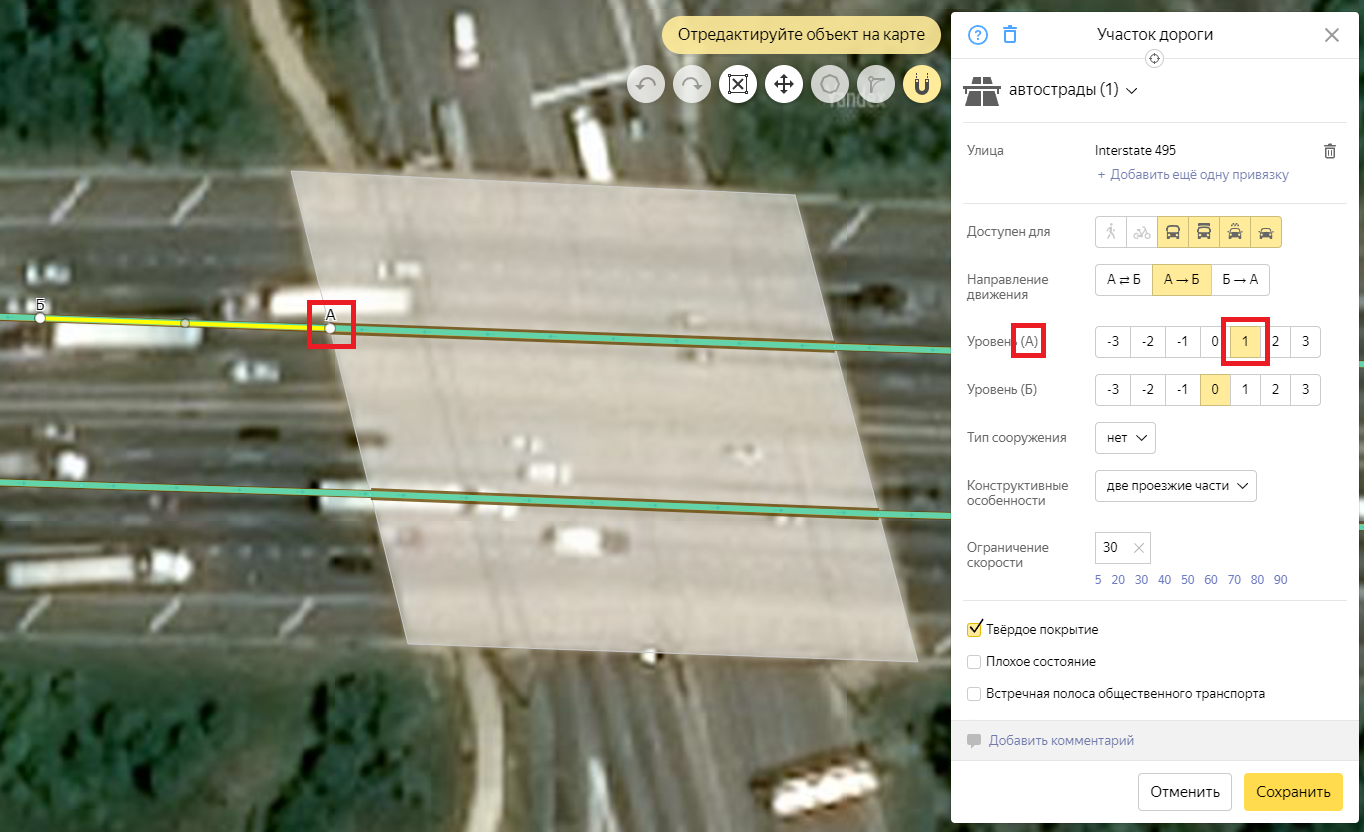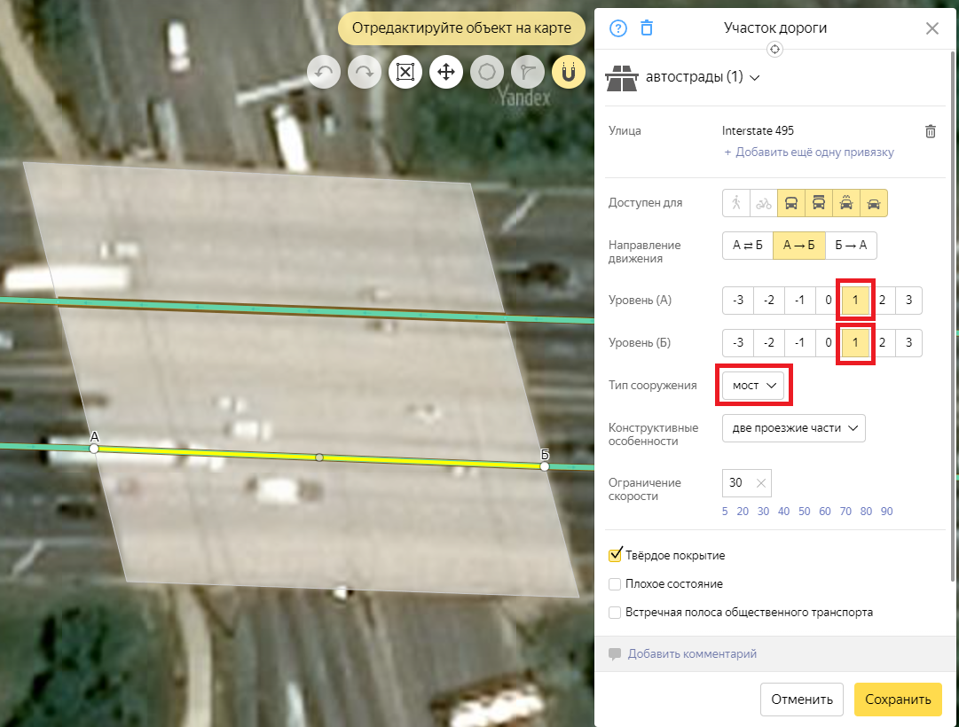 Теперь изменим атрибуты у участков дорог на мосту (в этапе #4 обозначен красным). Геометрию не меняем, изменим только несколько атрибутов ⚙️, это уровни А и Б, а также тип сооружения. В нашем случае можно изменить только тип сооружения, интерфейс автоматический повысит уровни до 1-1