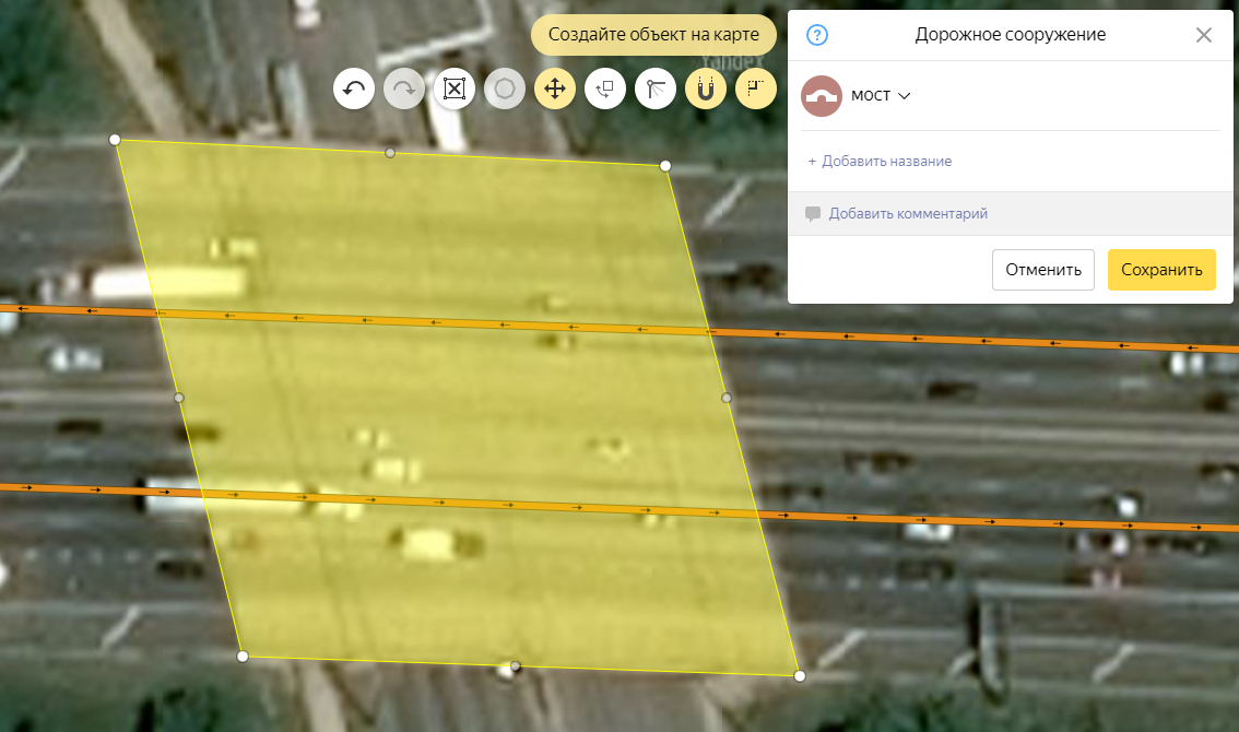 Обозначим сам мост, при помощи объекта из слоя «Дорожная инфраструктура». Ничего сложного, просто контур. Если будут трудности или сомнения, всегда можно заглянуть в пункт правил 3.8.1.1. Правила рисования дорожных сооружений. 😉
