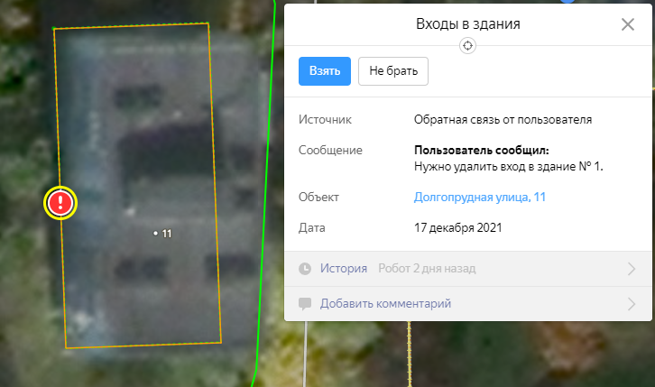В данном случае, пользователь просит удалить вход. Нужно проверить есть ли там вход, вход ли это в подъезд и правильный ли у него номер.