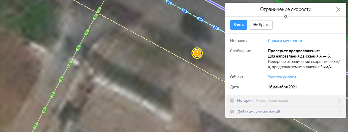 Робот распознал все верно, ограничение скорости 5 км/ч. Но местоположение неточности отмечено немного неправильно, поскольку эта дорога немного левее неточности. У дороги указанно ограничение скорости 20 км/ч, исправим эту ошибку и выставим резолюцию «Исправлено».