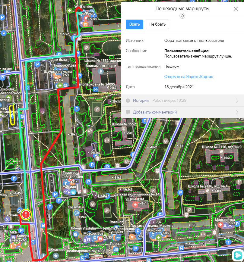 Если же пользователь сообщил о неоптимальном маршруте, но при этом все дороги по маршруту, предлагаемому пользователем, уже есть на карте и технически он может быть построен (например, если добавить промежуточную точку на нём), то бракуем неточность.