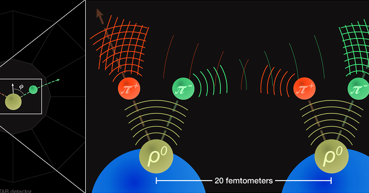Коллаборация STAR, базирующаяся на коллайдере RHIC, сообщила об экспериментах по исследованию ультрапериферических столкновений тяжелых ядер, сопровождающихся рождением пар пионов. Учет поляризации фотонов, которыми обмениваются ядра, позволил уловить эффекты квантовой интерференции в распределении импульсов промежуточных векторных мезонов. Новый эффект помог лучше понять распределение глюонов в ядрах, уточнить соответствующие ядерные радиусы, а также сравнить их с радиусами, полученными с помощью других методов и теории.