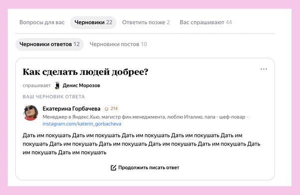 Теперь вы никогда не потеряете уже написанный ответ в редакторе. Даже если закроете Кью и откроете его на другом устройстве, – черновик ответа сохранится и будет доступен в отдельной ленте «Черновики».