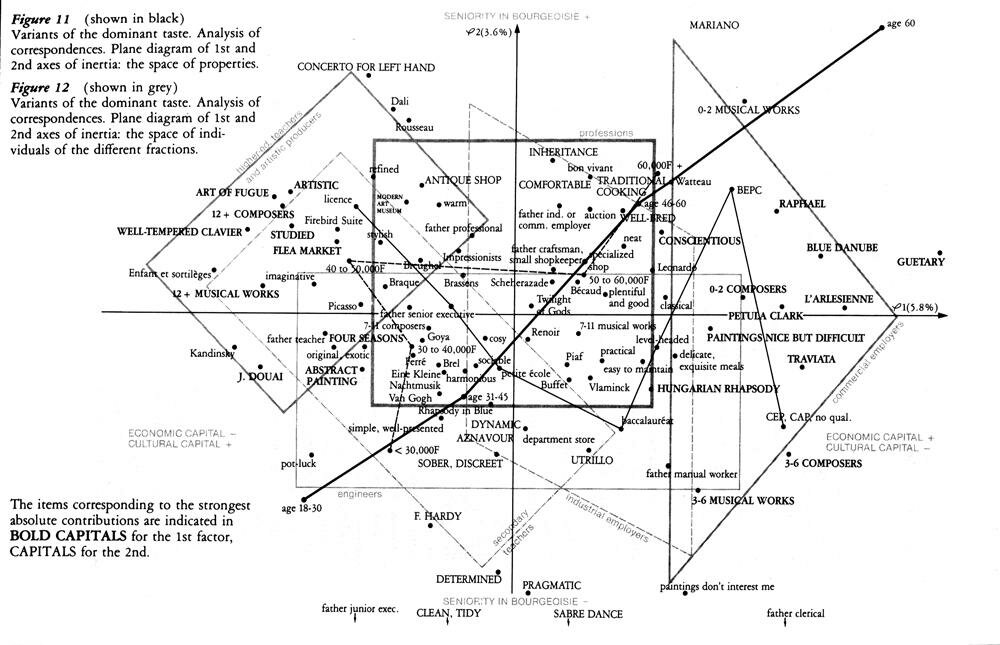 Картинка ниже — попытка Бурдье зафиксировать картину вкусов, социальной принадлежности и политических интересов в 1970-х во Франции.