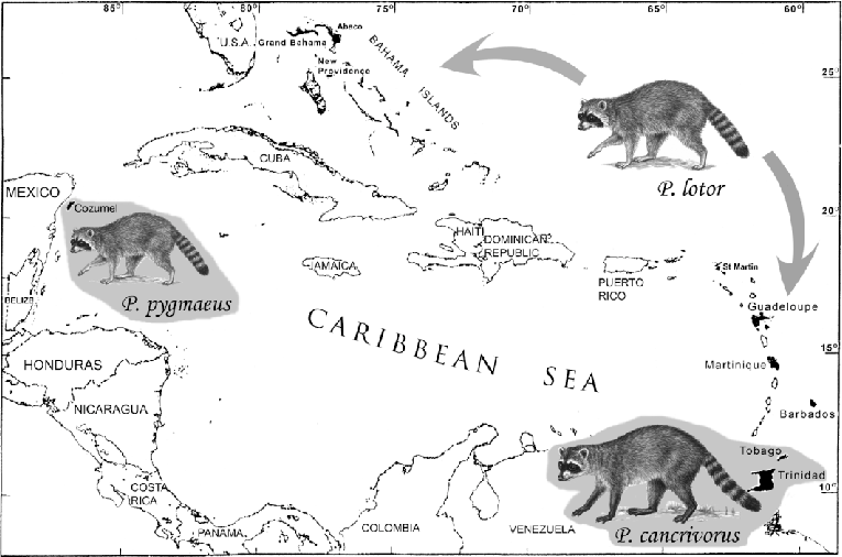 Карта Вест-Индии, показывающая распределение енотов на островах по всему региону. Североамериканский енот (Procyon lotor) встречается на всей территории Северной и Центральной Америки и был завезен на Багамы, Сен-Мартен, Гваделупа, Мартиника и Барбадос и, возможно, Ямайка. Енот-ракоед (Procyon cancrivorus) встречается на материковой части Южной Америки, а также на Тринидаде и Тобаго. Косумельский енот (Procyon pygmaeus), редкий вид енотов, обитающий только на мексиканском острове Косумель.