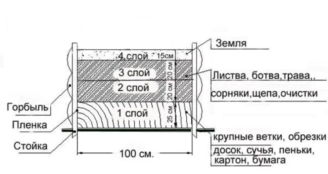 В процессе укладки каждый слой необходимо очень обильно проливать водой, чтобы процессы разложения протекали наиболее эффективно. Толщина слоев около 15-20 см.