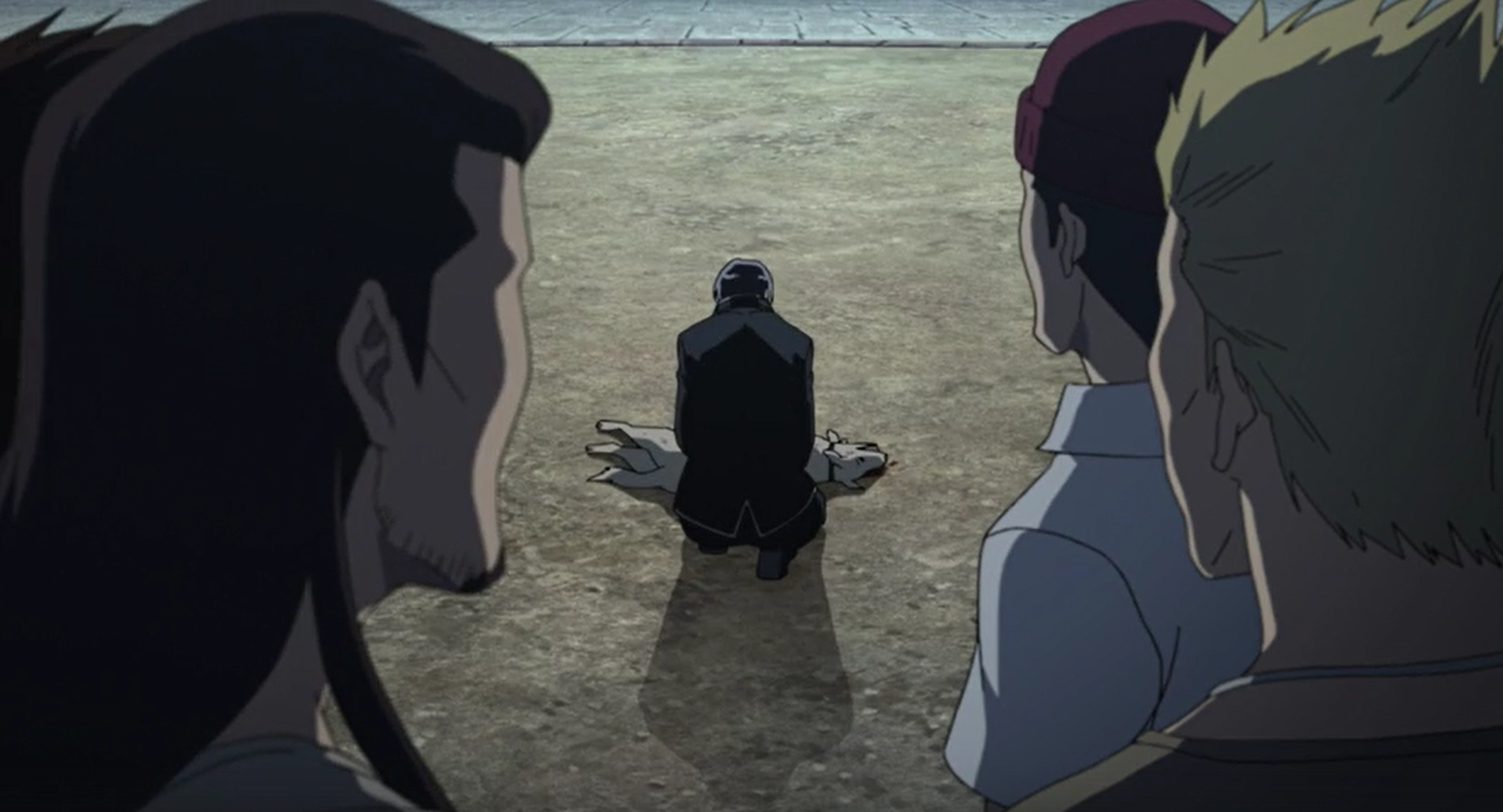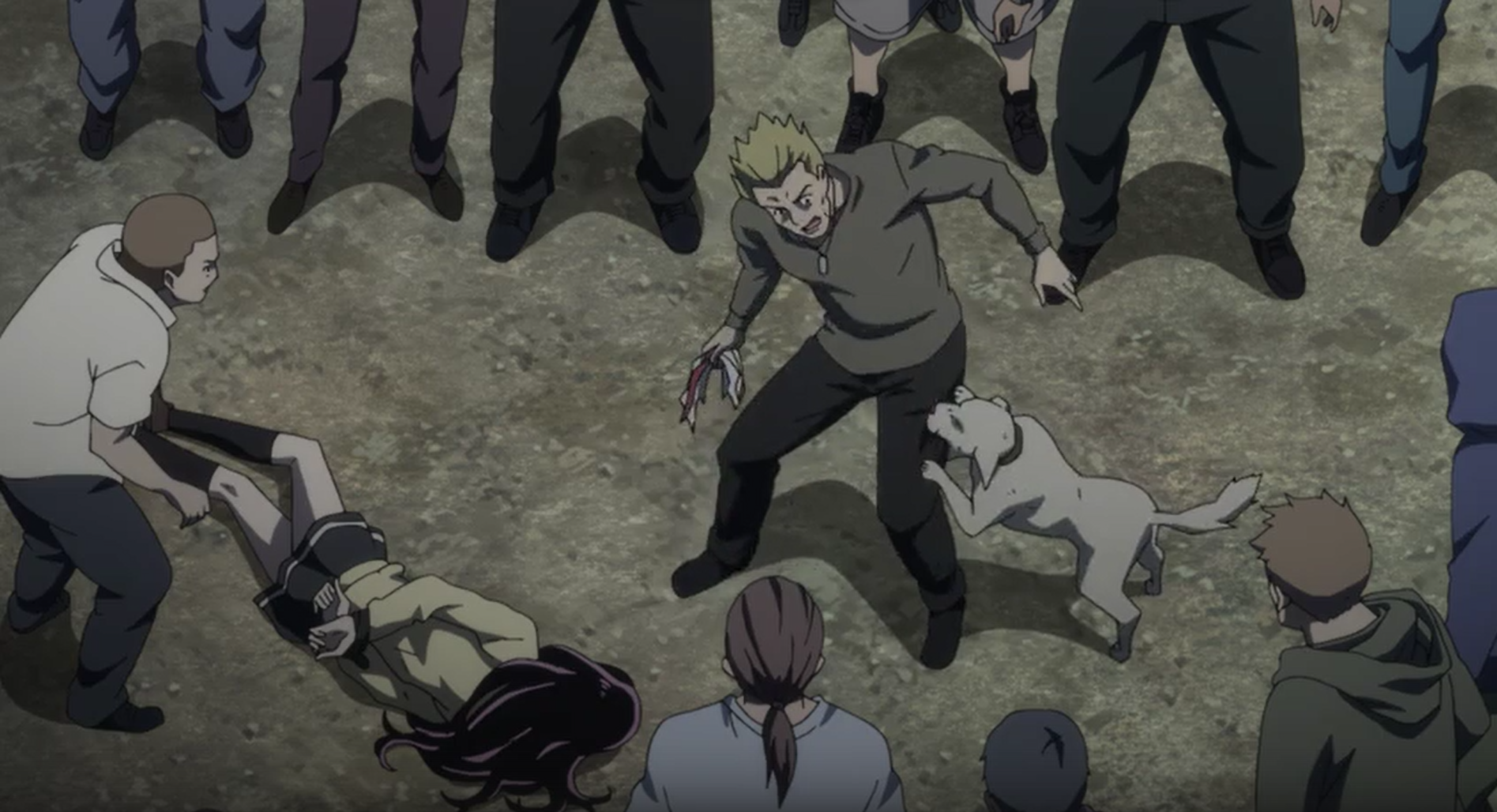В нем девушку пинают мужчины, подбегает собака, белая, здоровая, пытается защитить девушку, кусая за ногу мужика, но её откидывает ударом ноги,собака снова встаёт на лапы, и снова цепляется за ногу и её уже, как мяч, сначала пнули в одну сторону, потом, пока собака летела, её вдобавок другой мужик пнул и она упала и пошла кровь из пасти. К собаке подошёл парень, сел на корточки и он что-то сказал, не помню. К нему начал подходить мужик, пытаясь ударить, парень подставляет к его голове руку и происходит синее свечение из его руки и голова мужика исчезла, ее разорвало. Конец.