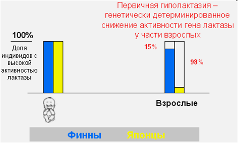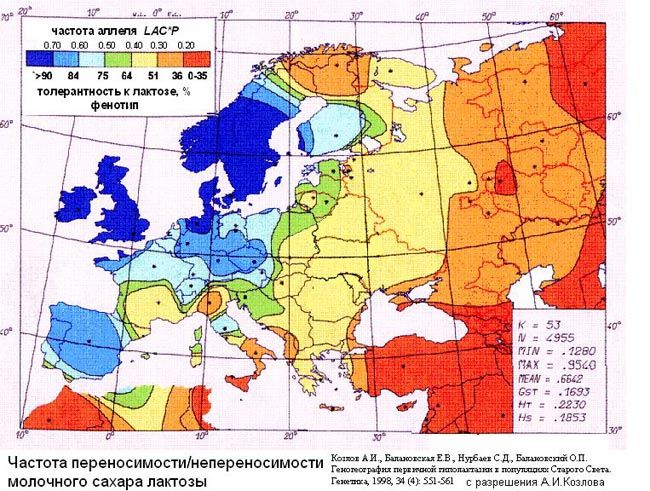 Развитие скотоводство - и питание молоком - изменило ферментный пищеварительный комплекс у скотоводческих народов. У всех млекопитающих, человека в том числе - новорожденные "детёныши" питаются молоком и имеют фермент ЛАКТАЗУ - расщепляющую молочный сахар лактозу до глюкозы. После периода молочного вскармливания, ген, отвечающий за синтез лактазы - дезактивируется, и при питании цельным молоком, у взрослого животного случается диарея...