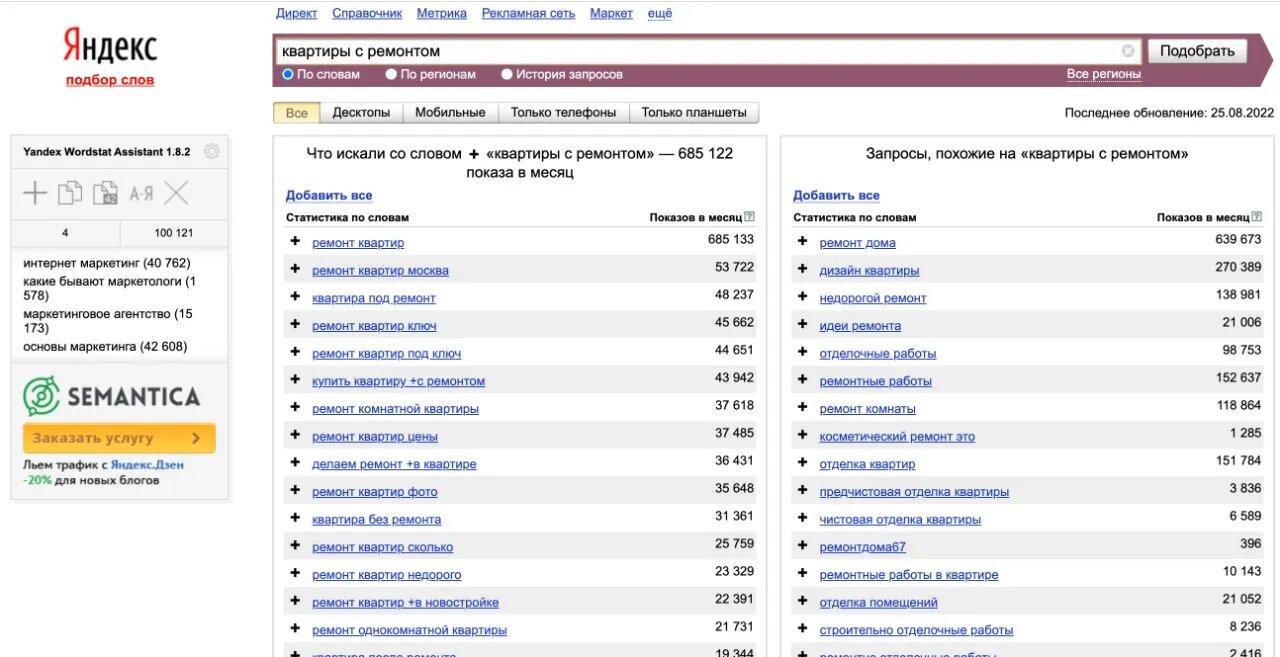 Подскажите синтаксис, который наиболее корректен для получения максимального числа релевантных показов для запроса "квартиры с ремонтом"?