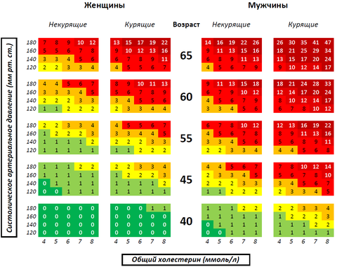 Посмотрим на шкалу SCORE, разработанную Европейским обществом кардиологов. Она показывает риск смерти в ближайшие 10 лет от патологии сердечно-сосудистой системы.