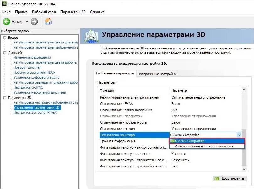 Активируйте в игре настройки G-SYNC, если они имеются, если же их нет, то включить можно в панели NVIDIA. В списке найдите поле «Технология монитора» и выберите «G-Sync Compatible». Это значение указывает системе, что дисплей совместим и активирует возможность использования FreeSync на экране.
