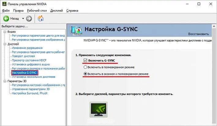 После включения этой опции, перейдите в боковое меню панели управления. Теперь в разделе Дисплей появится новая вкладка Настройка G-Sync.