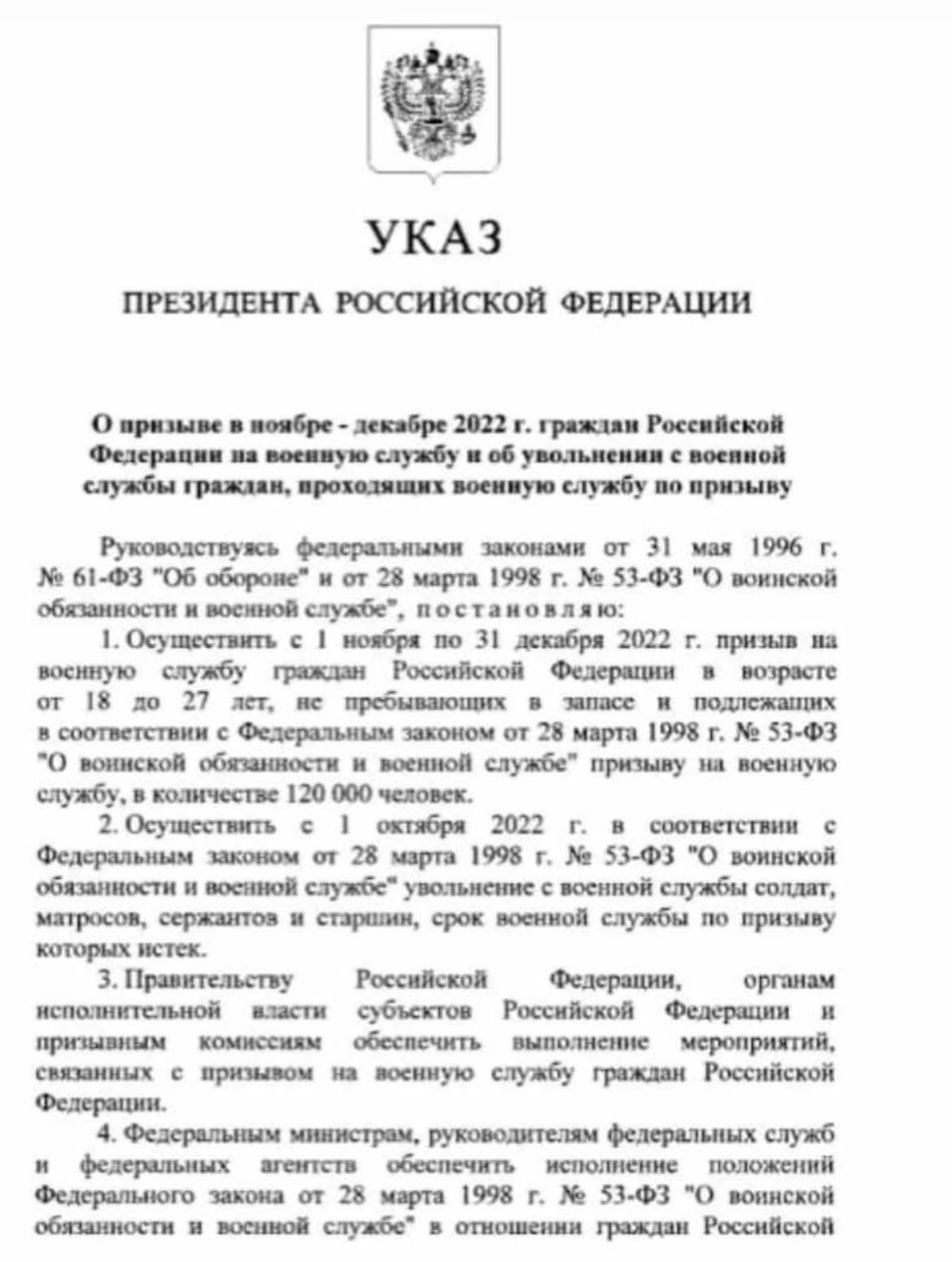 Да, Вы правы, согласно Указу Президента Российской Федерации от 30.09.2022 № 691 осенний призыв 2022 года начнется с 1 ноября и продлится до 31 декабря 2022 года.
